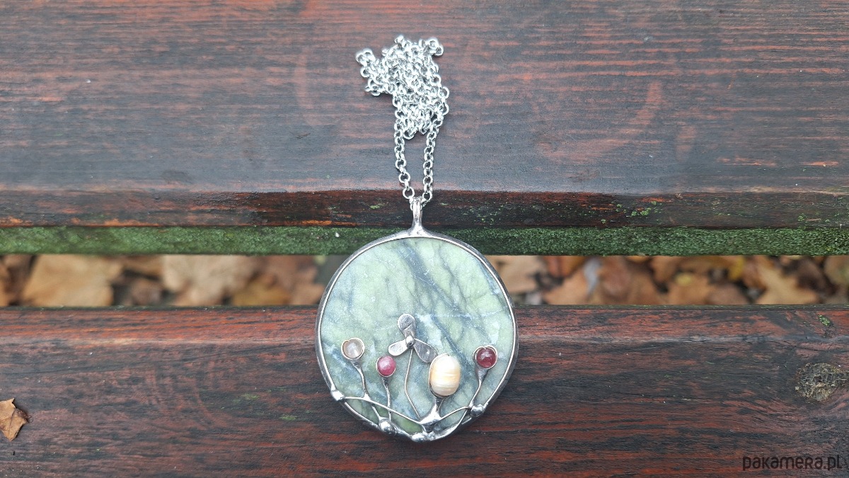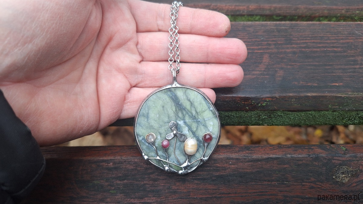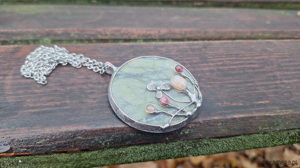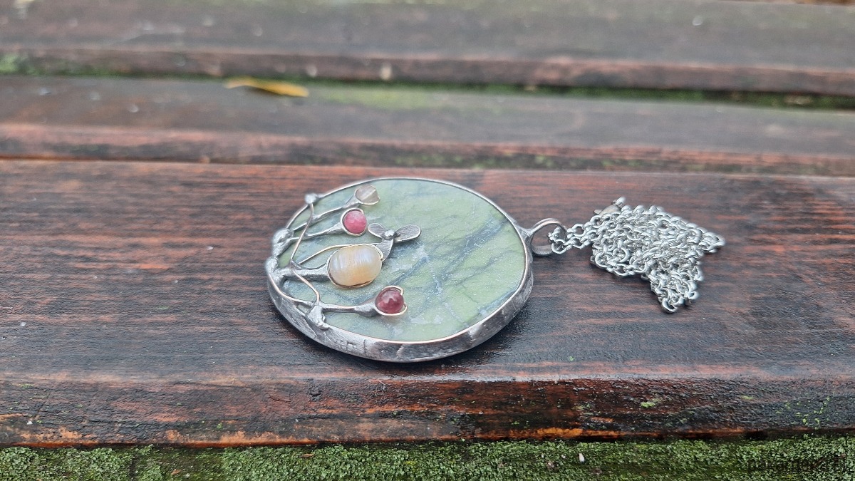 Wisiorek wykonany z miedzi, cyny, jadeitu, turmalinów i perły. Wymiary ok. 5 na 5 cm. Zawieszony na łańcuszku o długości ok. 50 cm.