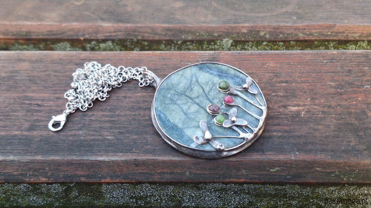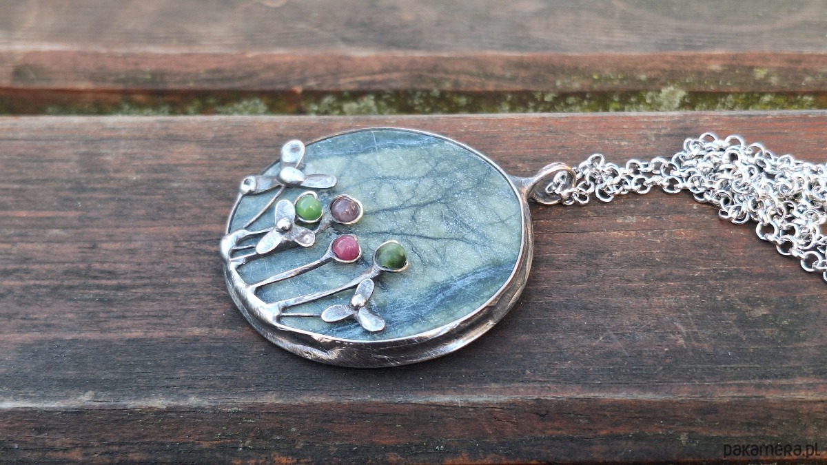 Wisiorek wykonany z miedzi, cyny, jadeitu, turmalinów. Wymiary ok. 5 na 5 cm. Zawieszony na łańcuszku o długości ok. 50 cm.