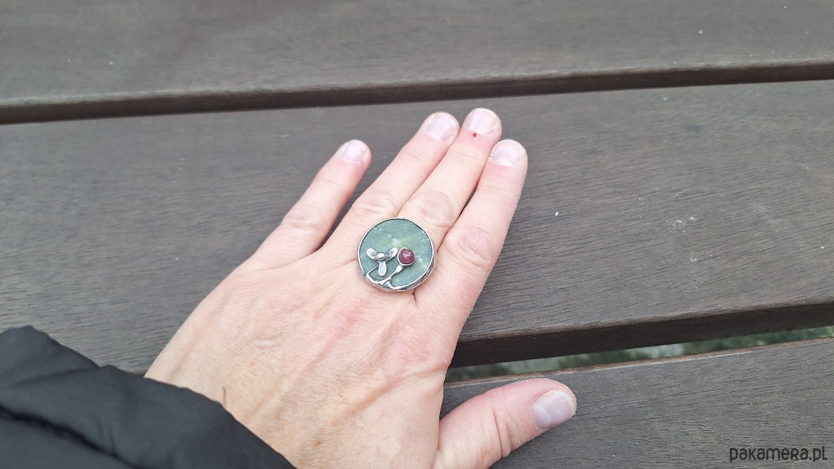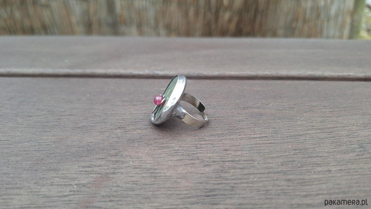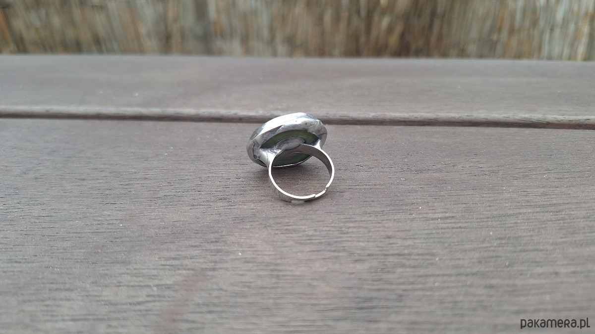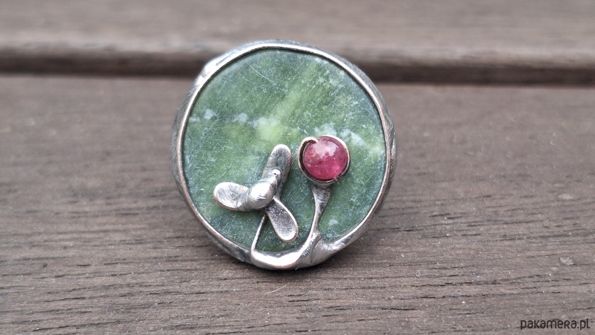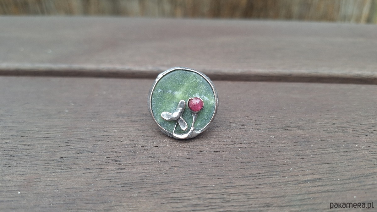Pierścionek wykonany z miedzi, cyny, turmalinu i jadeitu. Wymiary ok. 2.5 na 2.5 cm. Regulowany. Nie jest ciężki.
