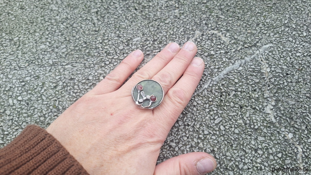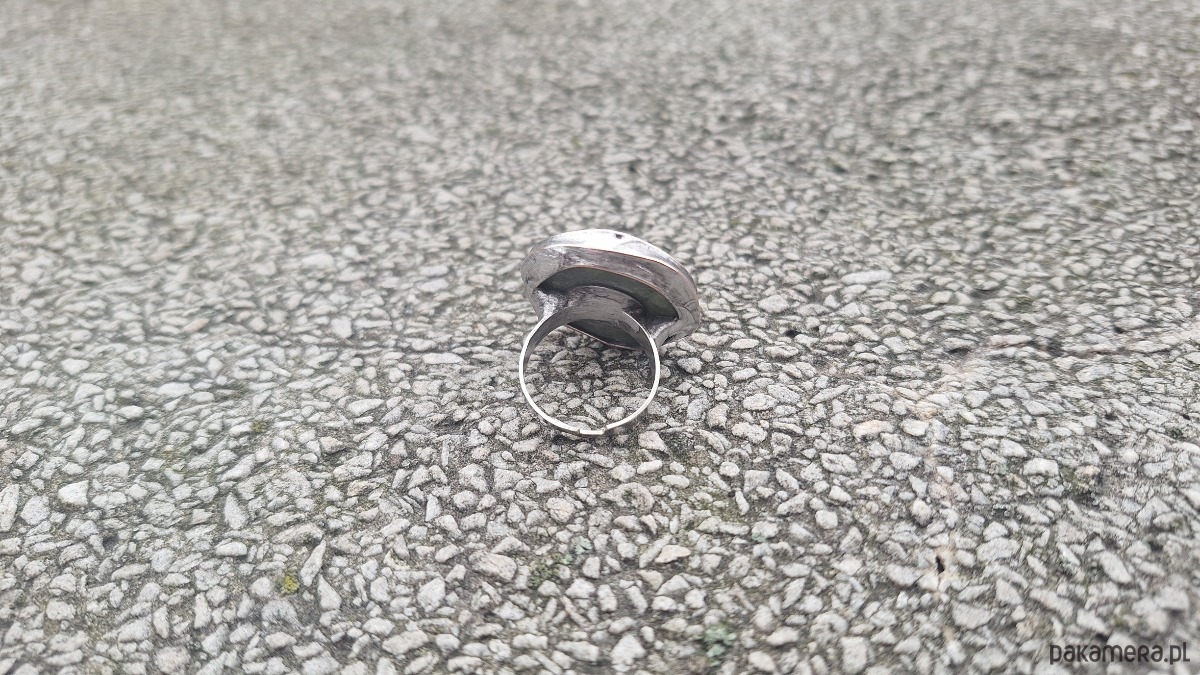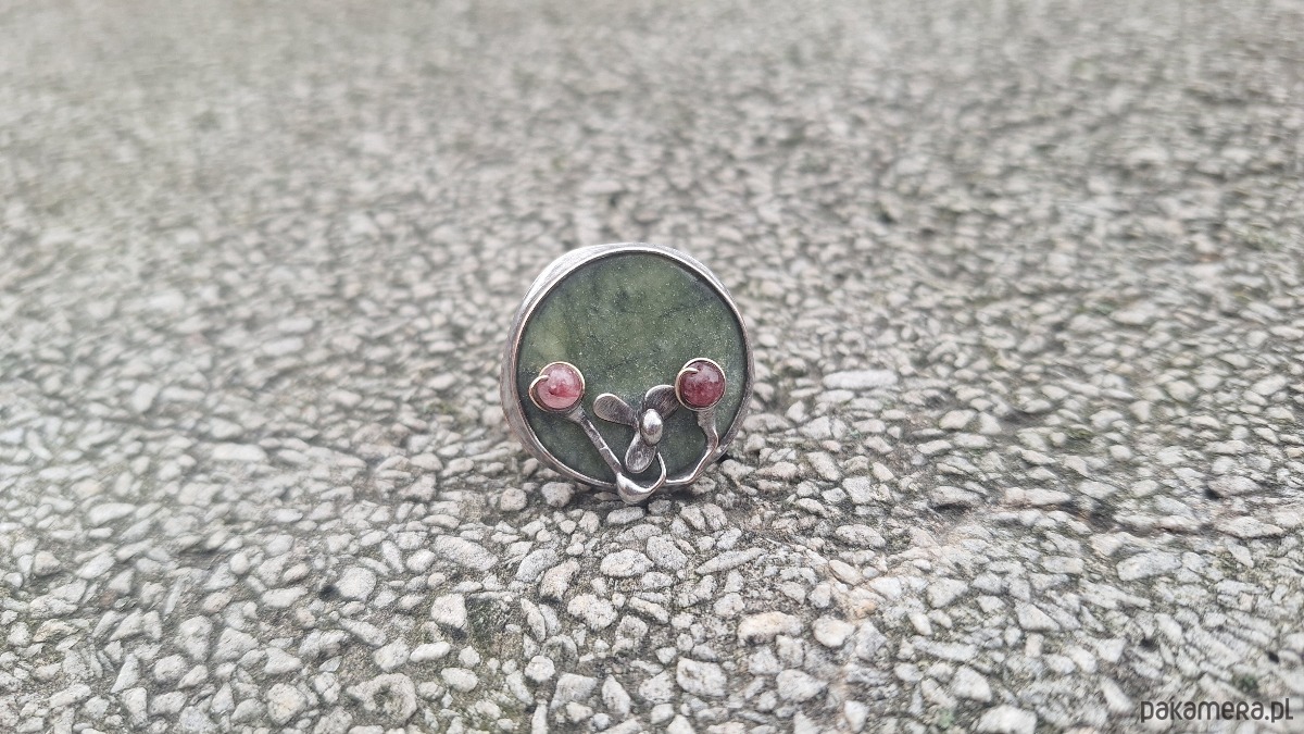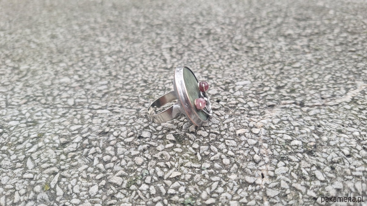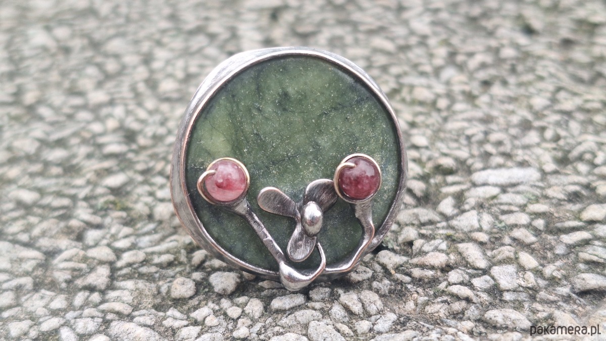 Pierścionek wykonany z miedzi, cyny, turmalinu i jadeitu. Wymiary ok. 2.5 na 2.5 cm. Regulowany. Nie jest ciężki.