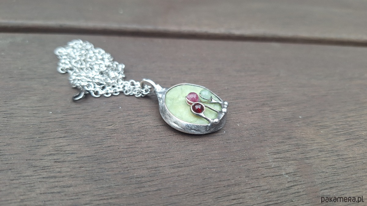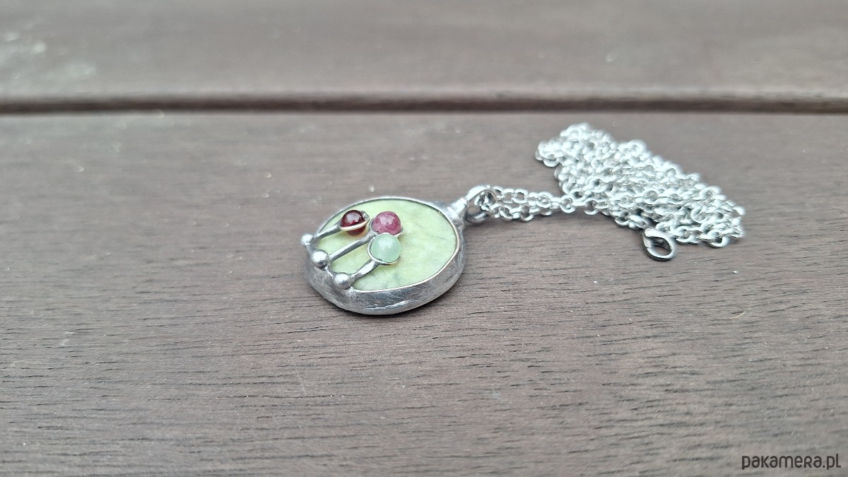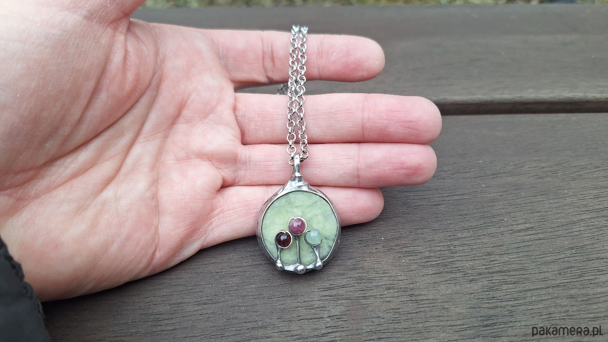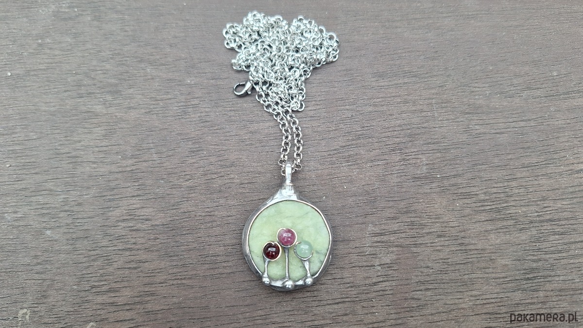 Wisiorek wykonany z miedzi, cyny, jadeitu, turmalinu, granatu. Wymiary ok. 2.5 na 2.5 cm. Zawieszony na łańcuszku o długości ok. 50 cm.