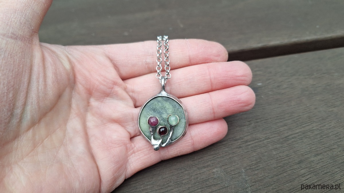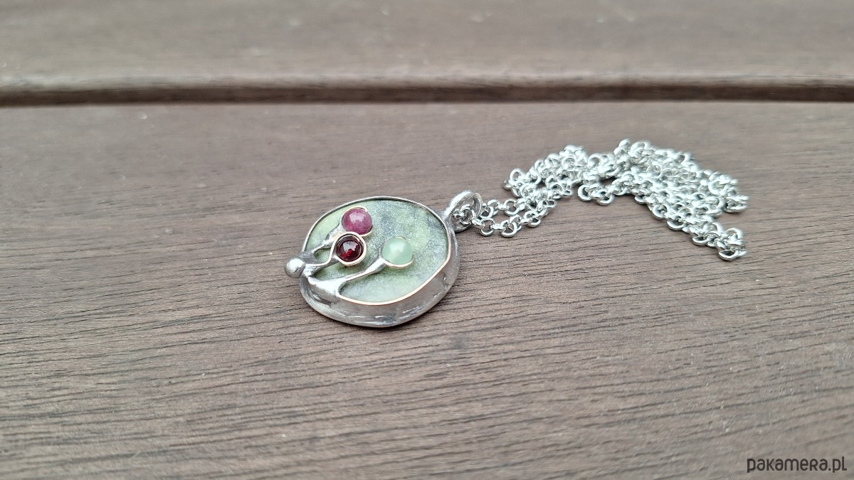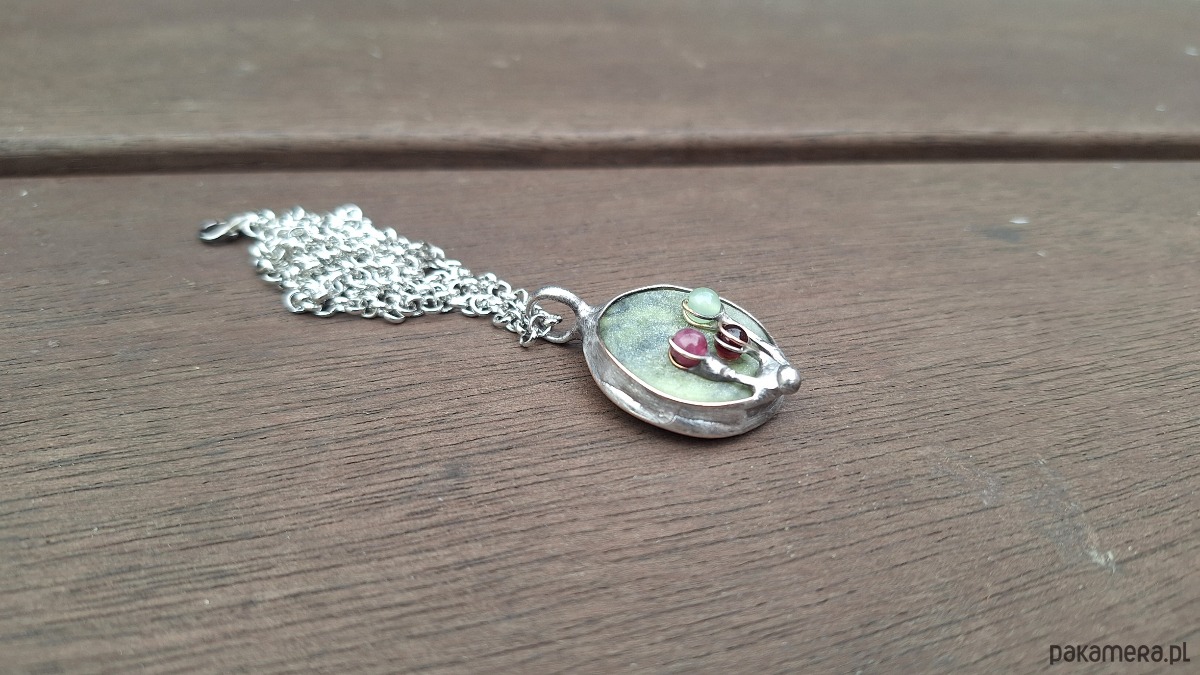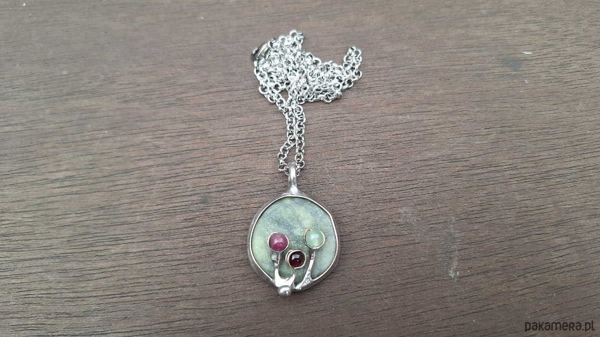 Wisiorek wykonany z miedzi, cyny, jadeitu, turmalinu, granatu. Wymiary ok. 2.5 na 2.5 cm. Zawieszony na łańcuszku o długości ok. 50 cm.