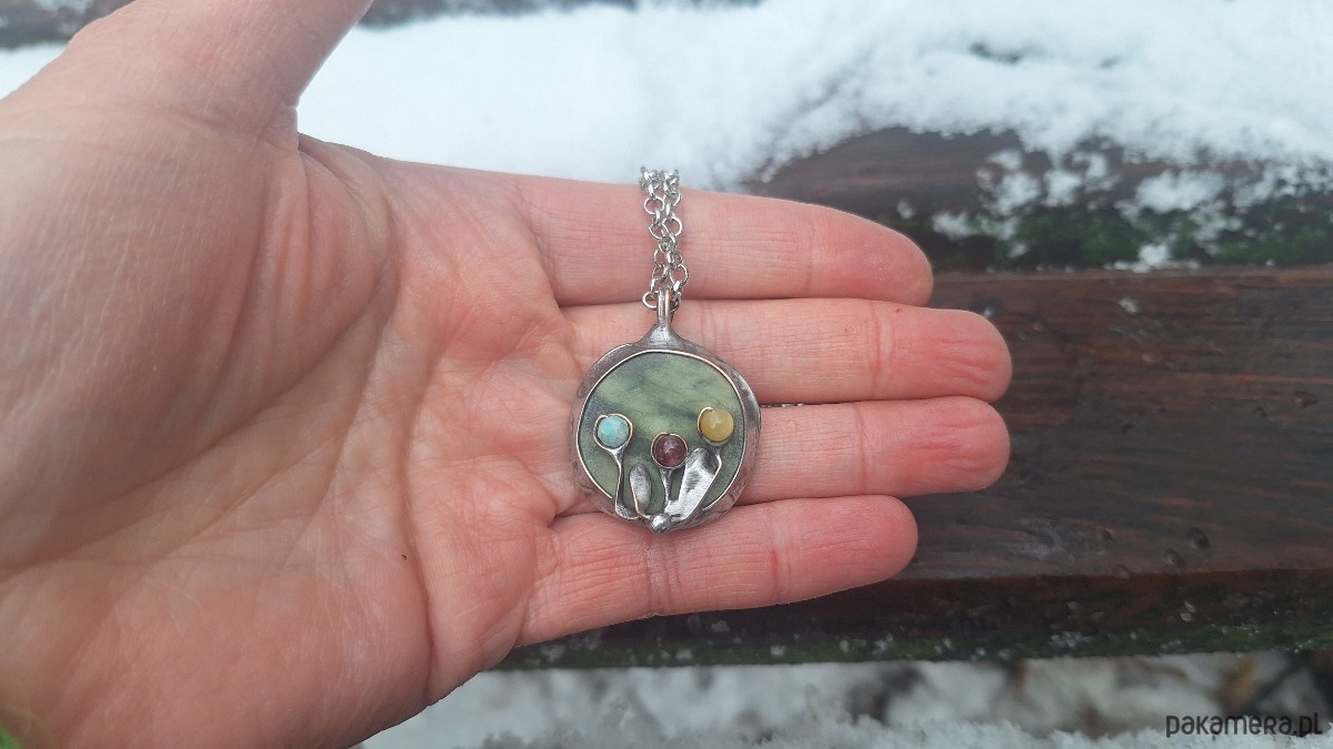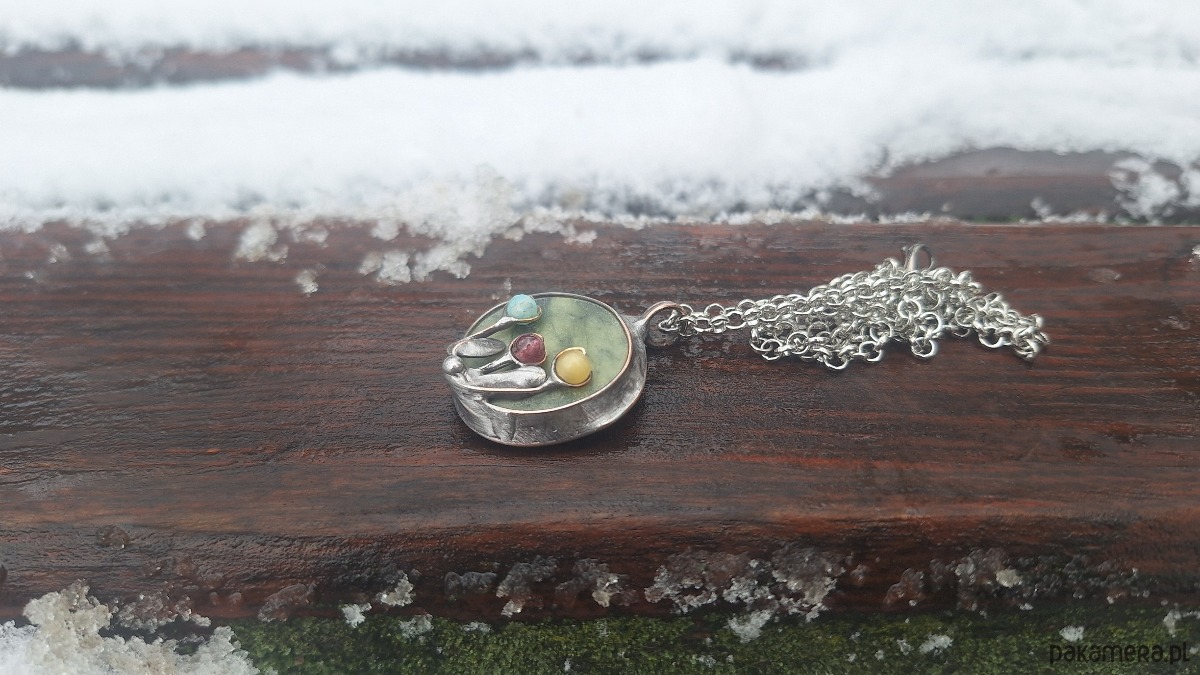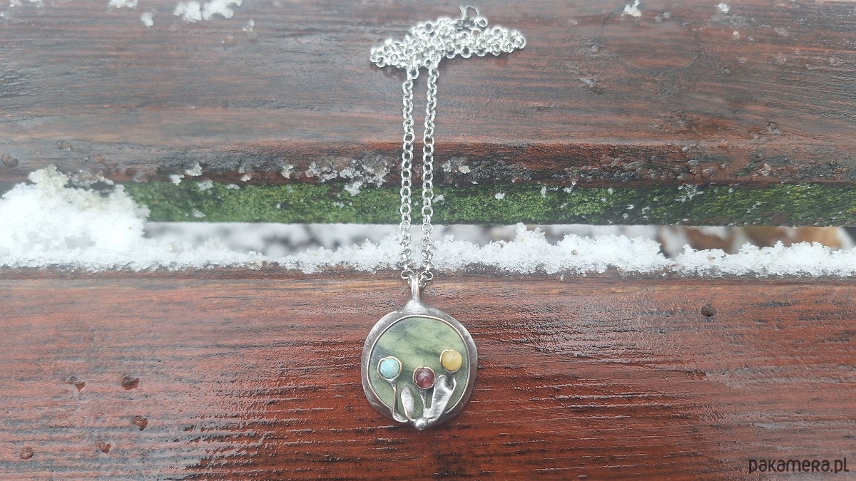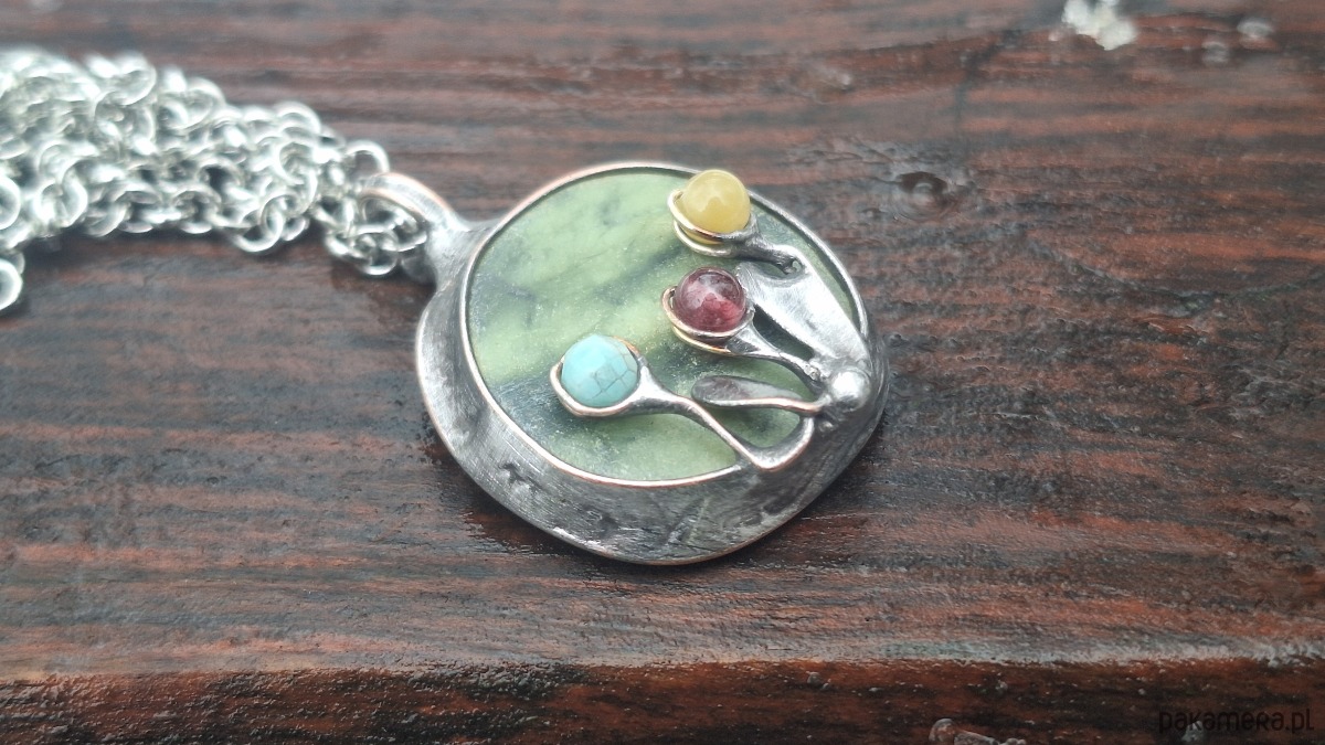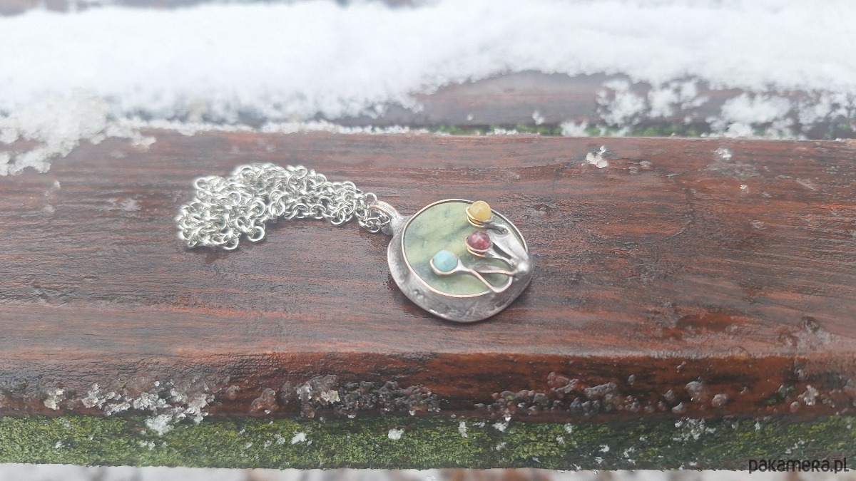 Wisiorek wykonany z miedzi, cyny, jadeitu, turmalinów, amazonitu. Wymiary ok. 2.5 na 2.5 cm. Zawieszony na łańcuszku o długości ok. 50 cm.