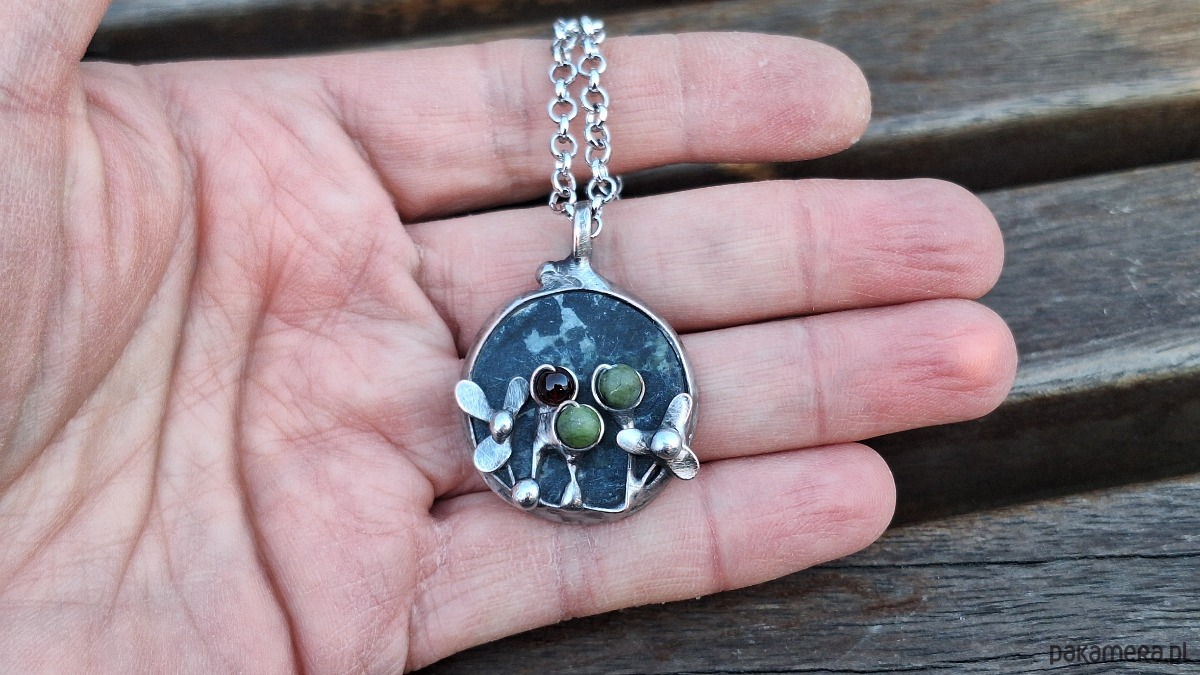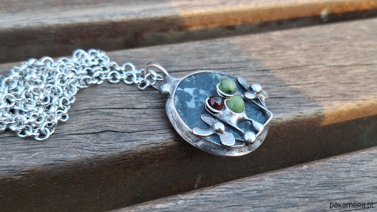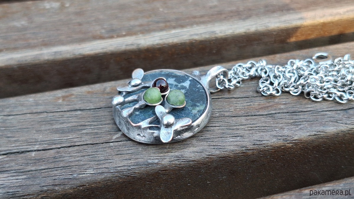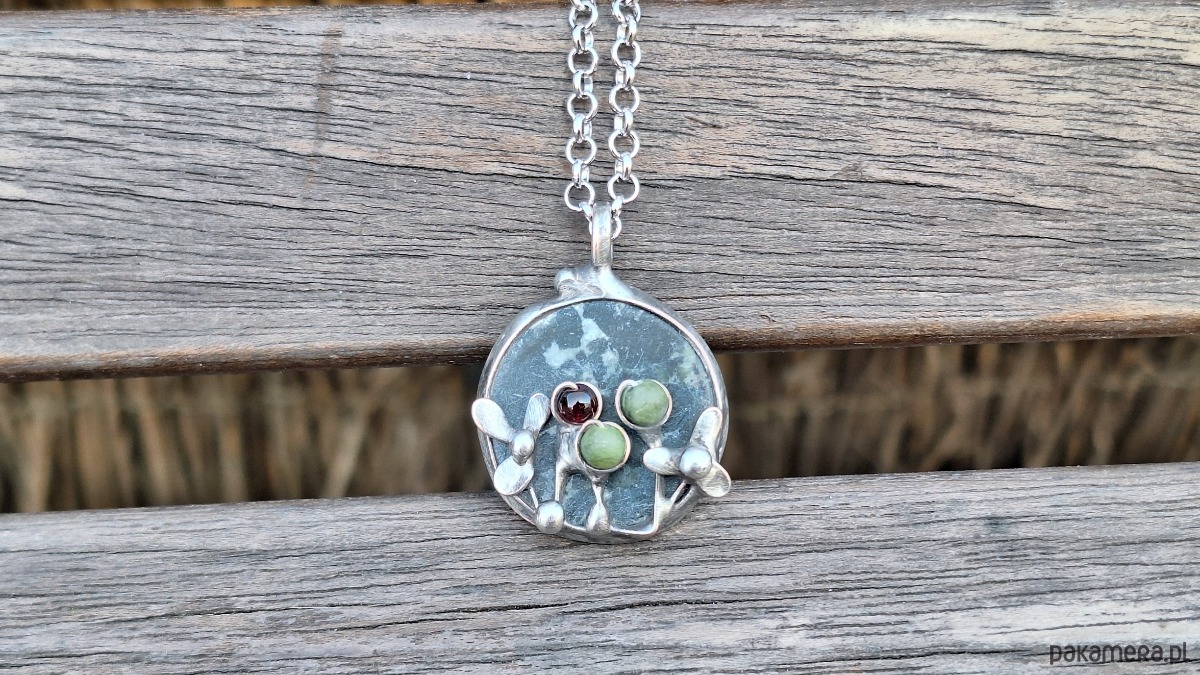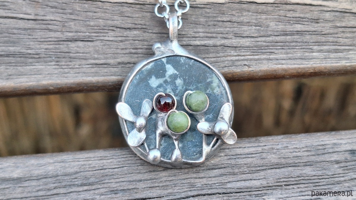 Wisiorek wykonany z miedzi, cyny, jadeitu, nefrytów i granatu. Wymiary ok. 2.5 na 2.5 cm. Zawieszony na łańcuszku o długości ok. 50 cm.