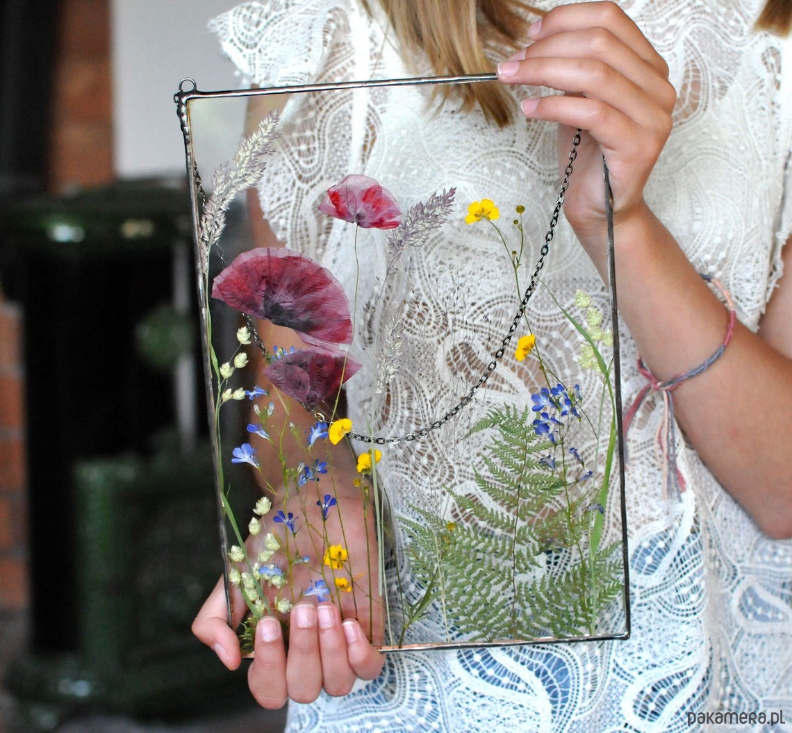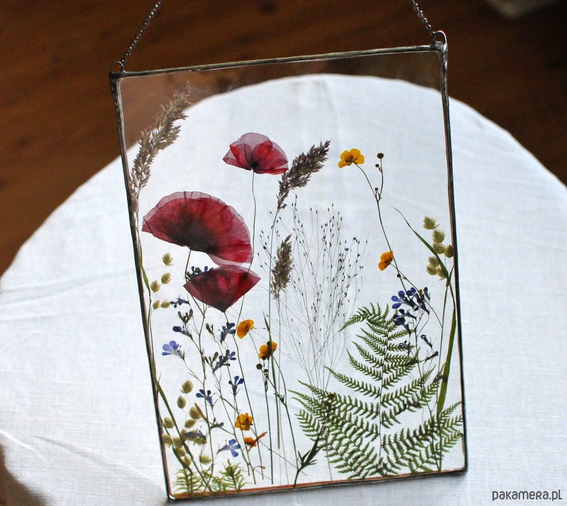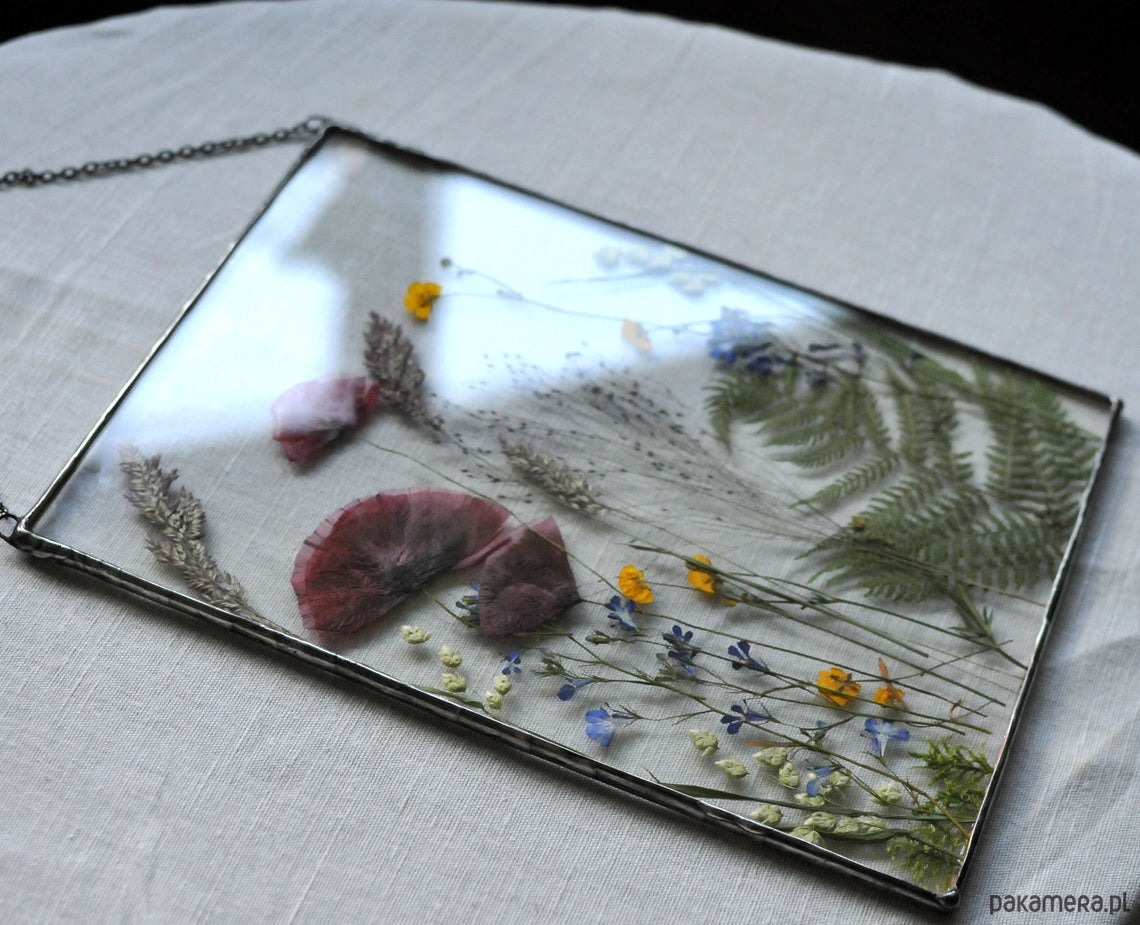 Proponuję ten oryginalny dekor, z prawdziwych, suszonych kwiatów, który łączy w sobie dwie sztuki: witrażownictwa i suszenia roślin.