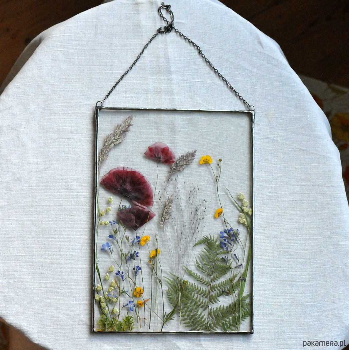 Szklany witraż formatu A4 z dekoracją z suszonych kwiatów i polnych roślin.