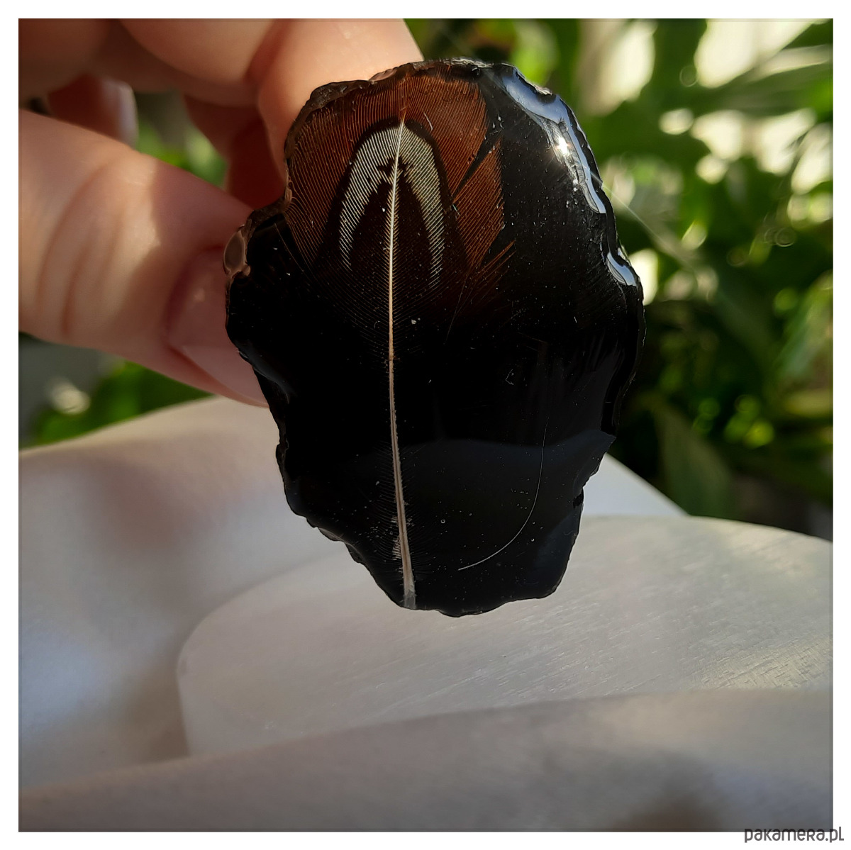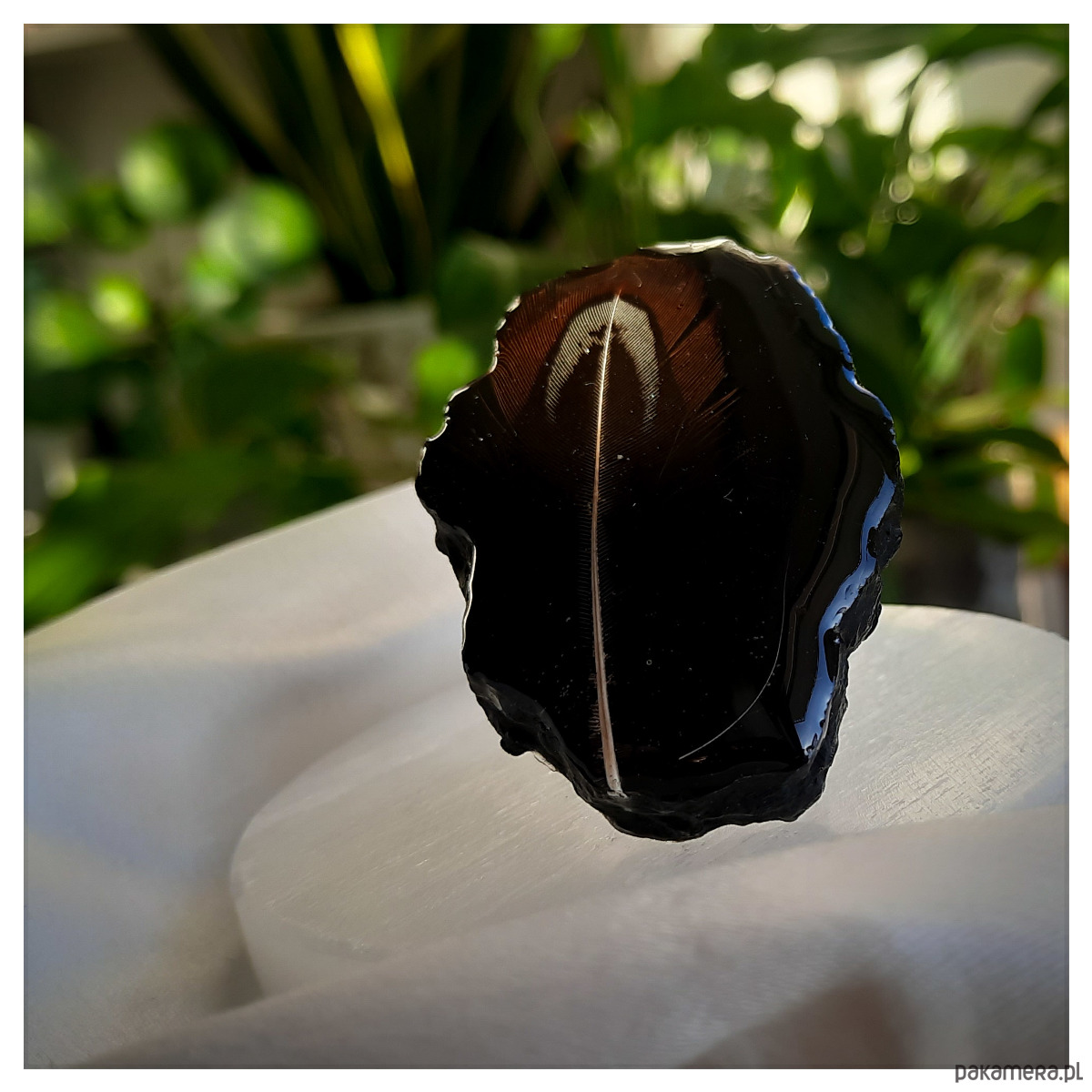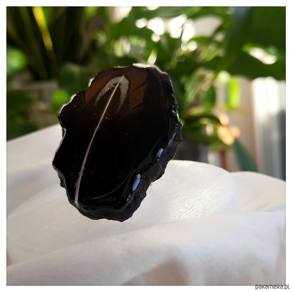 Pierścionek z zatopionym w żywicy epoksydowej piórkiem.