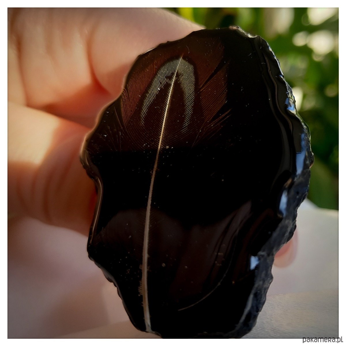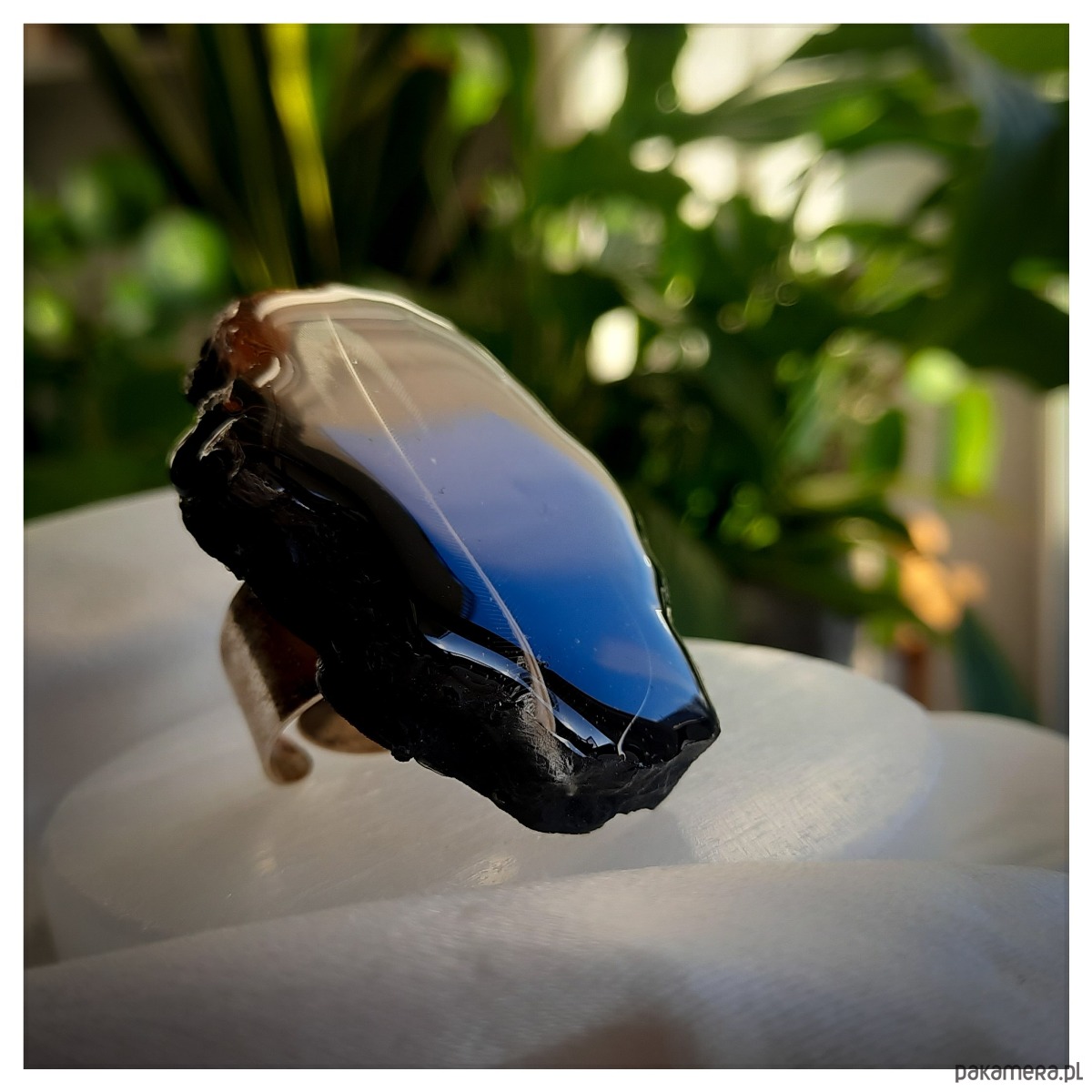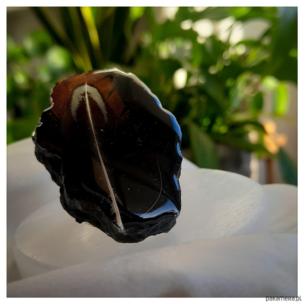 Pierścionek z zatopionym w żywicy epoksydowej piórkiem.
