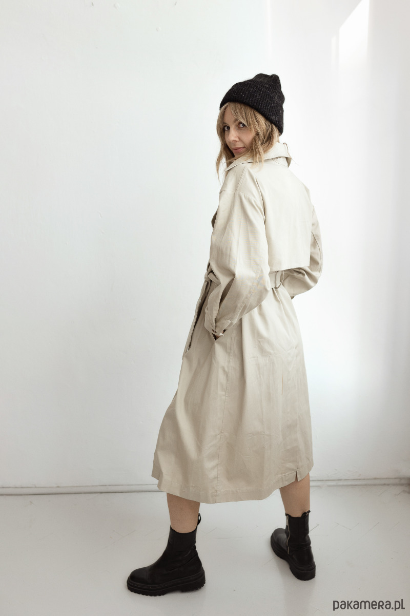 Dość obszerny fason, zapinany na guziczek wewnętrzny oraz regulowany guzikami z przodu. Dodatkowo wiązany w pasie. Rękawy zwężane i zapinane na guziczki. Klasyczny kołnierz, ozdobna klapa z przodu i z tyłu to nasza propozycja płaszcza idealnego. Można ubierać pod niego obszerne swetry i bluzy, w zależności od nastroju i okazji.