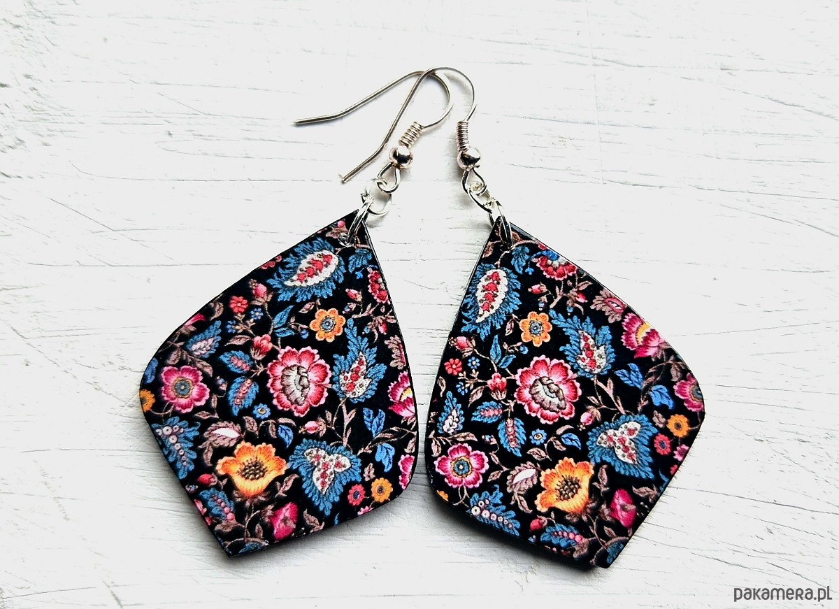 kolczyki drewniane, ozdobione metodą decoupage, dwustronne, starannie wykończone farbami akrylowymi i zabezpieczone wielokrotnie lakierem, bigle posrebrzane, długość kolczyków bez bigli: 5 cm, szerokość: 3,5 cm, bardzo lekkie