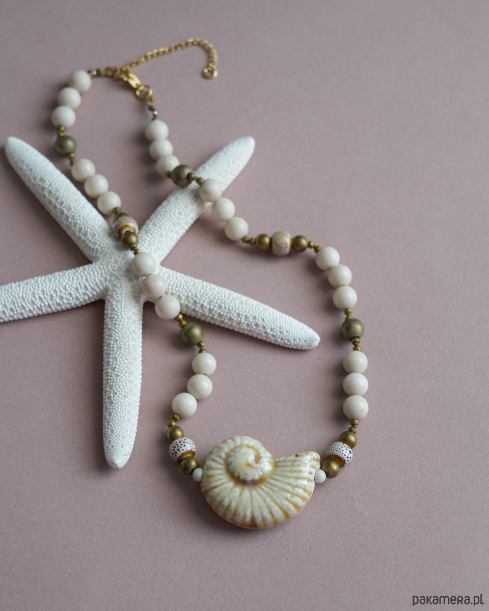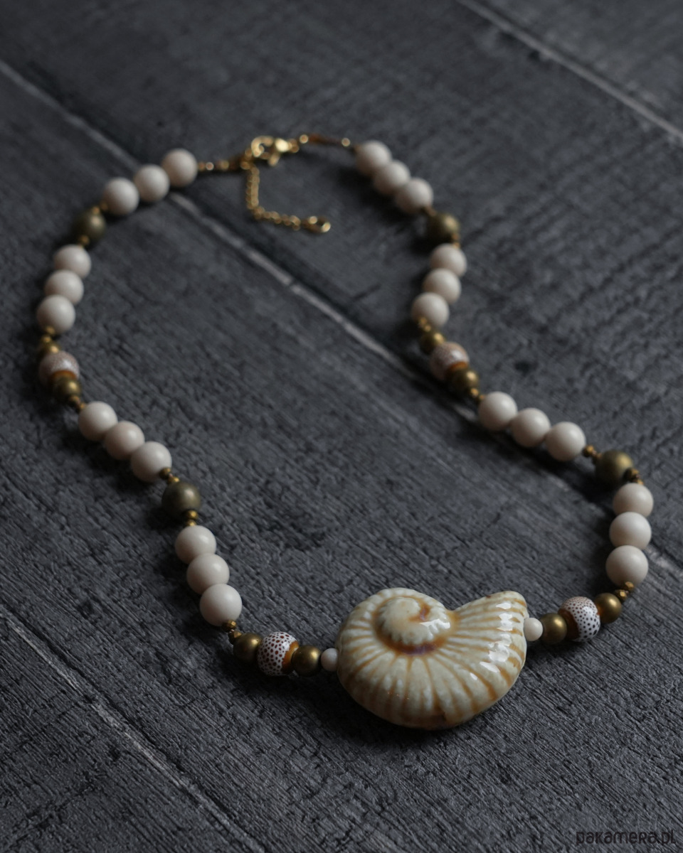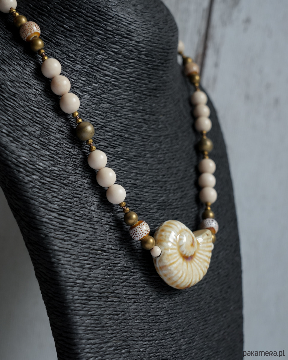 Niezwykle okazały, bardzo oryginalny i wyjątkowy naszyjnik z dużą MUSZLĄ CERAMICZNĄ, wykonany z beżowego KAMIENIA RZECZNEGO, matowego HEMATYTU w kolorze starego mosiądzu oraz kilku ozdobnych koralików z CERAMIKI. Zapięcie i łańcuszek to STAL SZLACHETNA w kolorze złotym. Naszyjnik jest dosyć ciężki.