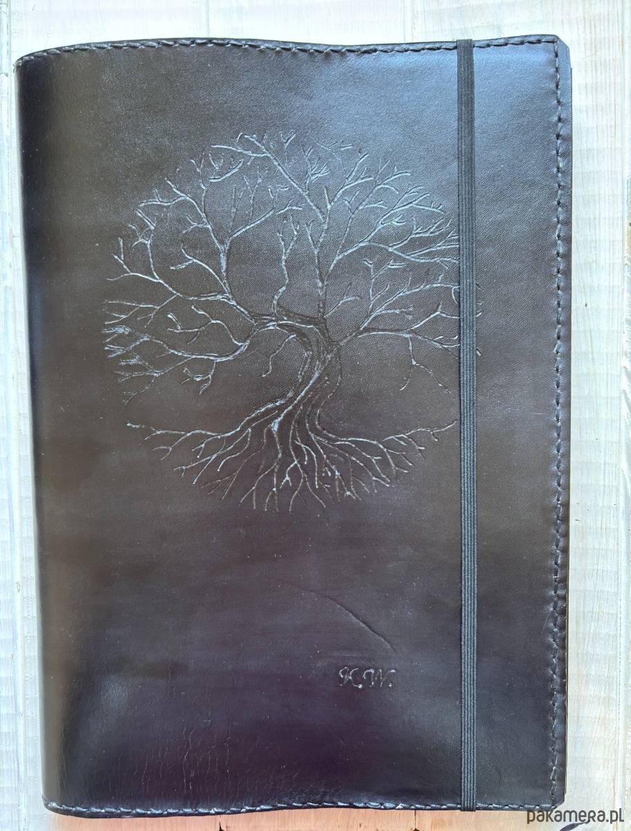 Elegancka okładka, która doda wyjątkowego charakteru każdemu notesowi, kalendarzowi czy pamiętnikowi. Wykonana z wysokiej jakości skóry naturalnej bydlęcej licowej garbowanej roślinnie o grubości 1,2 mm, ręcznie barwionej na klasyczny czarny kolor. Motyw drzewa, wykonany metodą ręcznego grawerowania, sprawia, że każda okładka jest niepowtarzalna. Ręczne szycie podkreśla staranność wykonania, a możliwość wymiany wkładów czyni ją funkcjonalnym dodatkiem na długie lata.