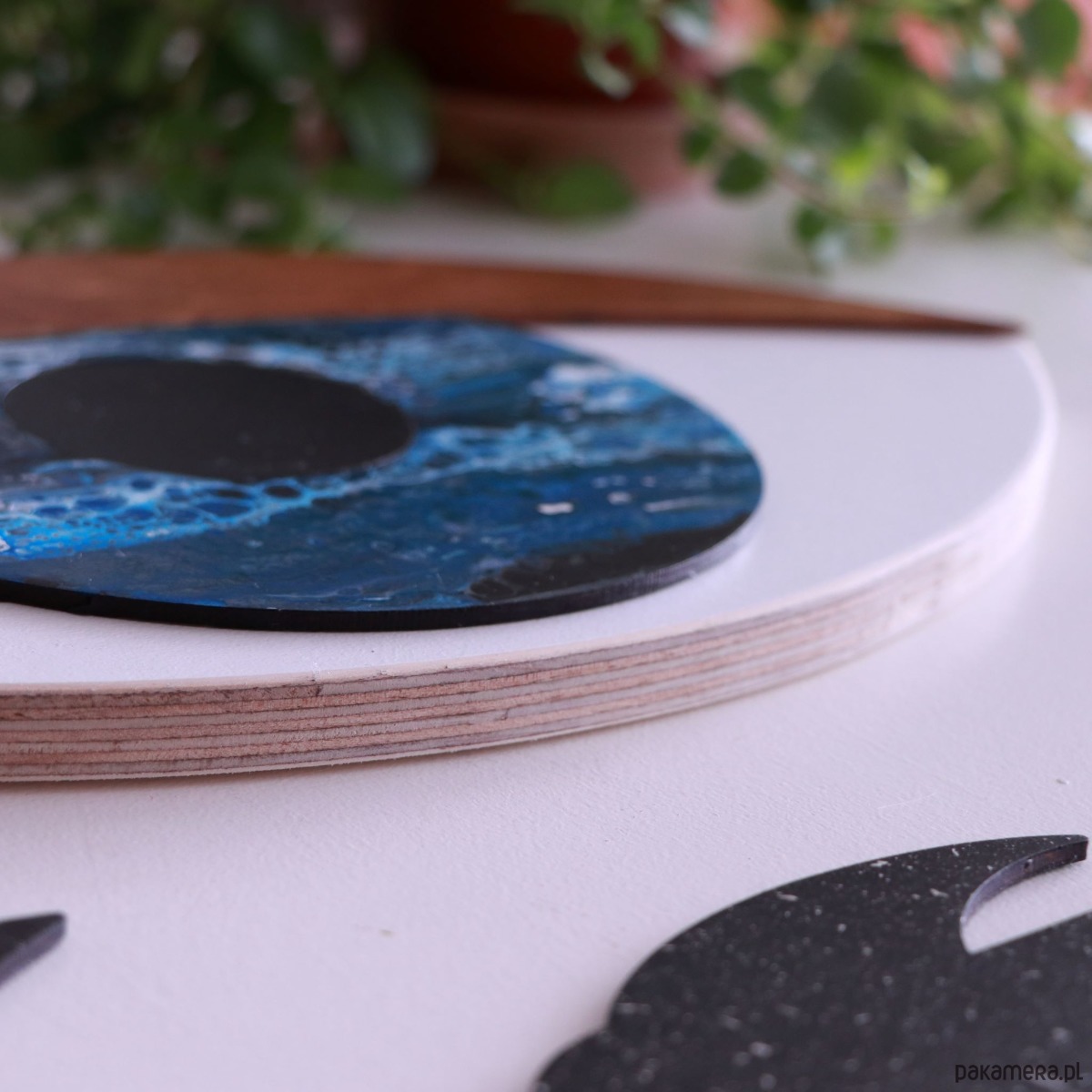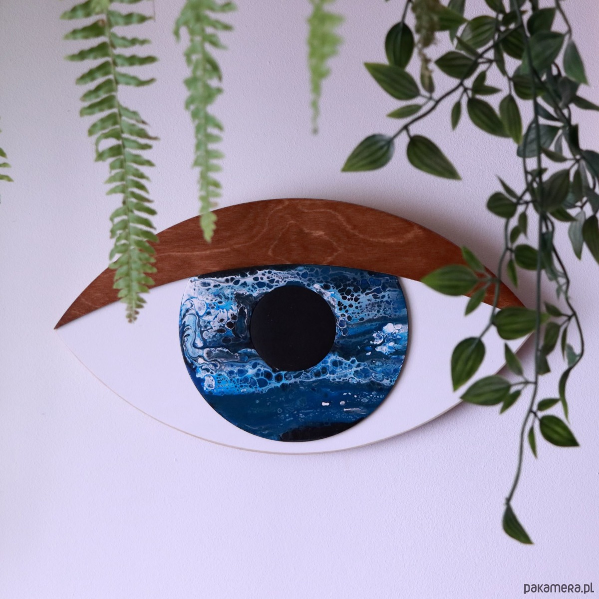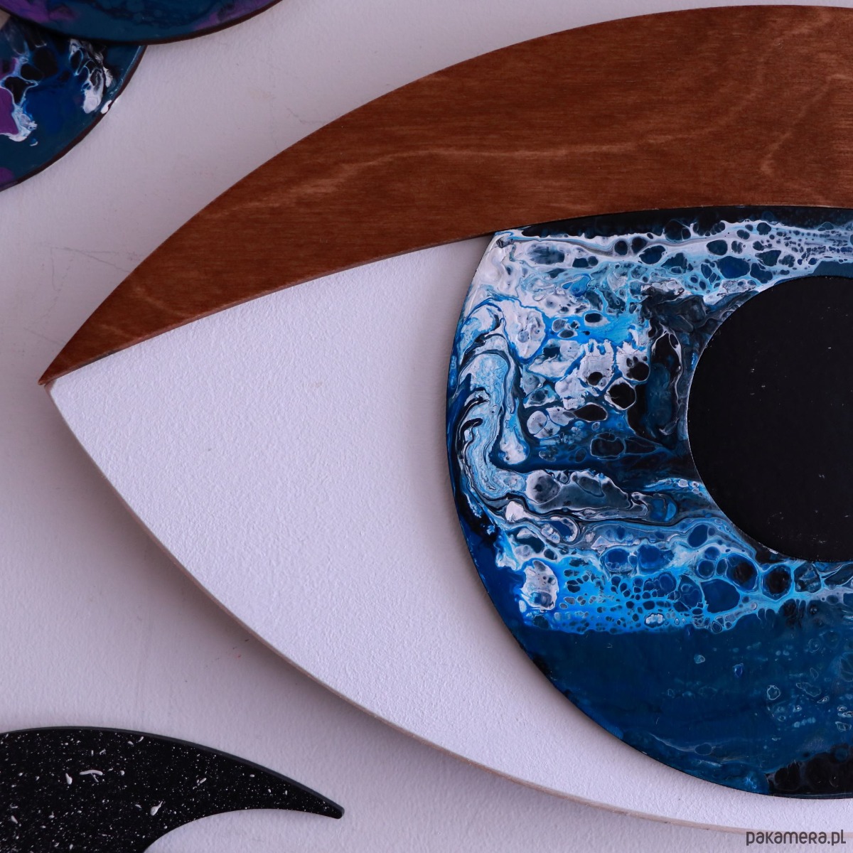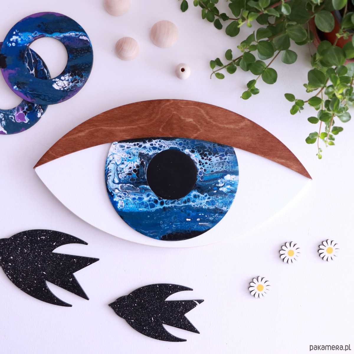 Dekoracja ze sklejki o grubości 12 mm . Ozdobne oko z tęczówką malowaną metodą acrylic poouring. Mieszanka kilku kolorów farb tworzy wyjątkowe i niepowtarzalne wzory .