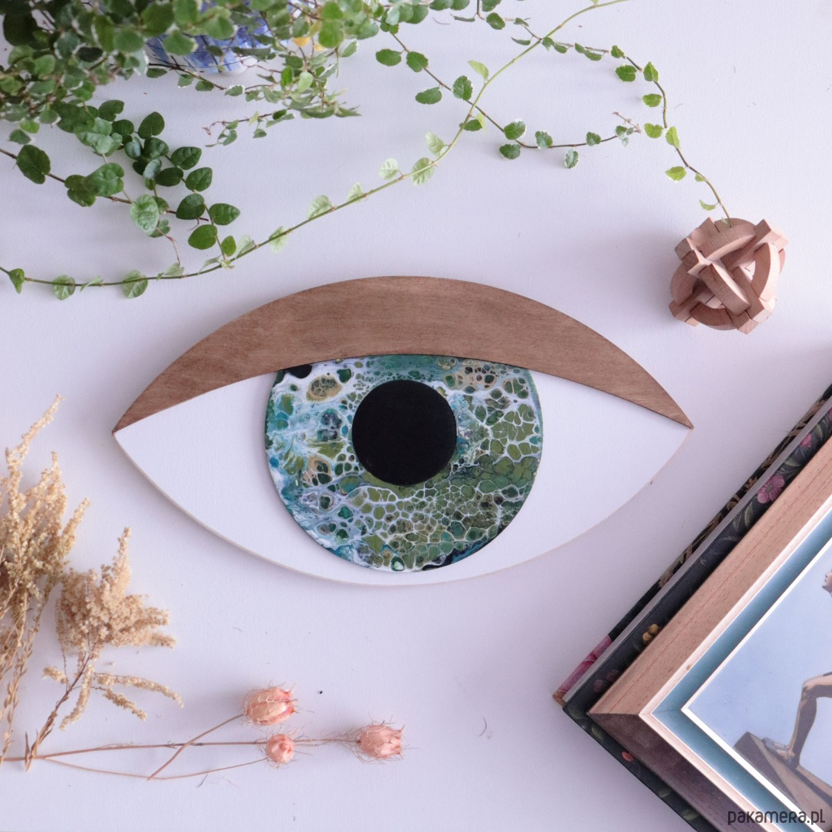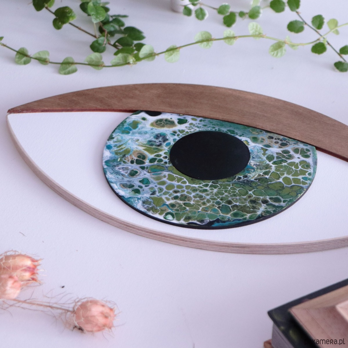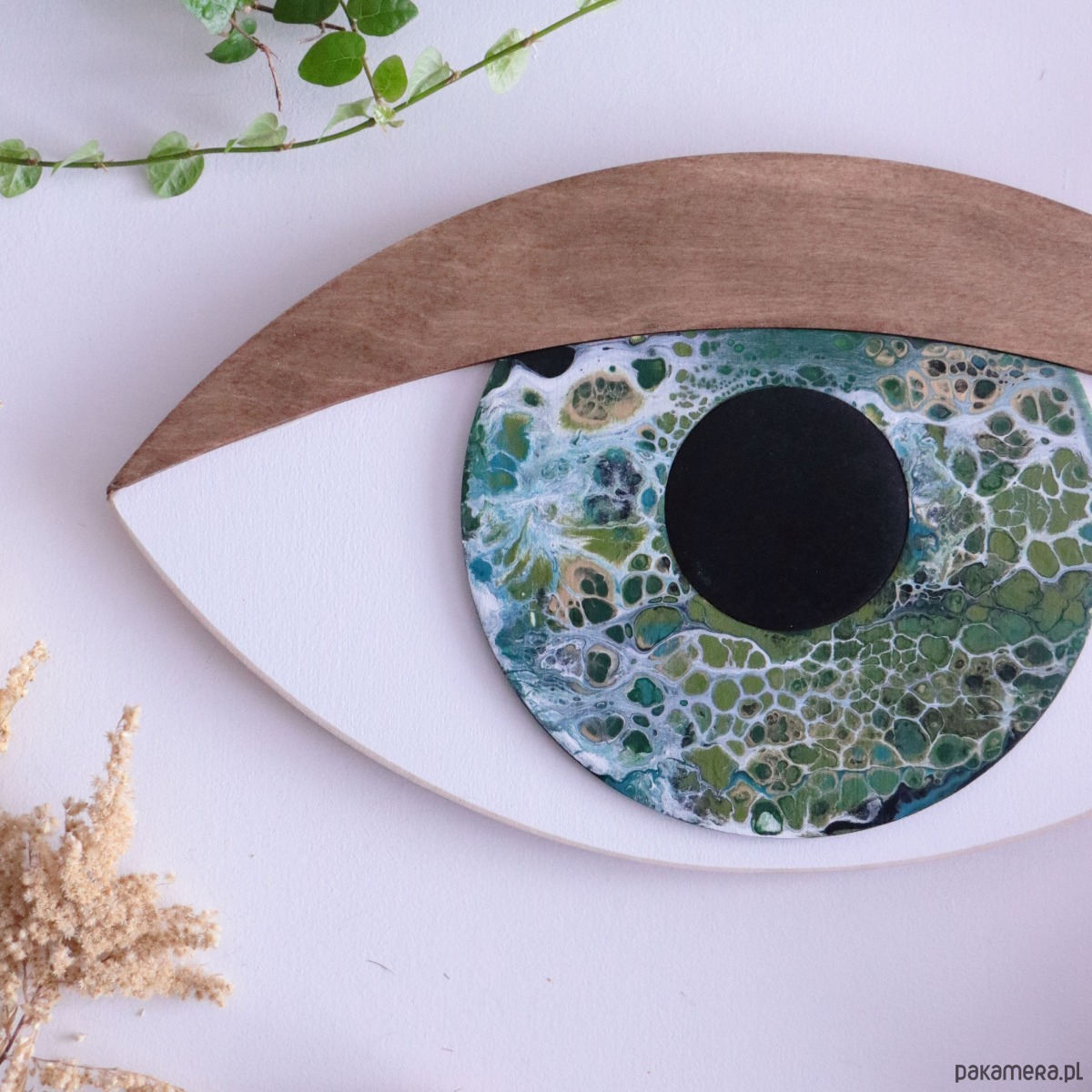 Dekoracja ze sklejki w wersji 3D to oczy wycinane w sklejce, gdzie każdy z elementów jest naklejany i malowany osobno. Dzięki temu dekoracje zyskują trójwymiarowość i niezwykłą precyzję wykonania. Tęczówka malowana metodą acrylic pouring. Mieszanka kilku kolorów farb daje zaskakujący artystyczny efekt.