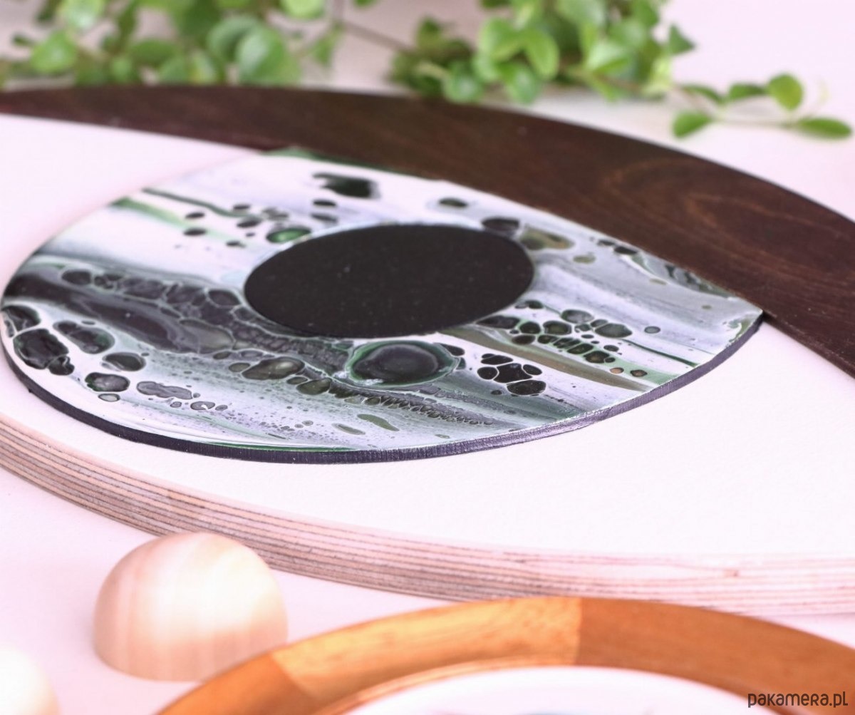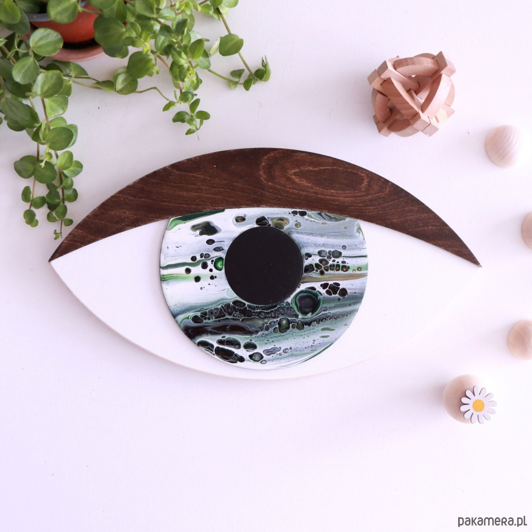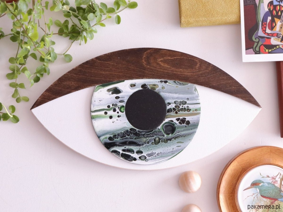 Dekoracja ze sklejki o grubości 12 mm . Ozdobne oko z tęczówką malowaną metodą acrylic poouring. Mieszanka kilku kolorów farb tworzy wyjątkowe i niepowtarzalne wzory .
