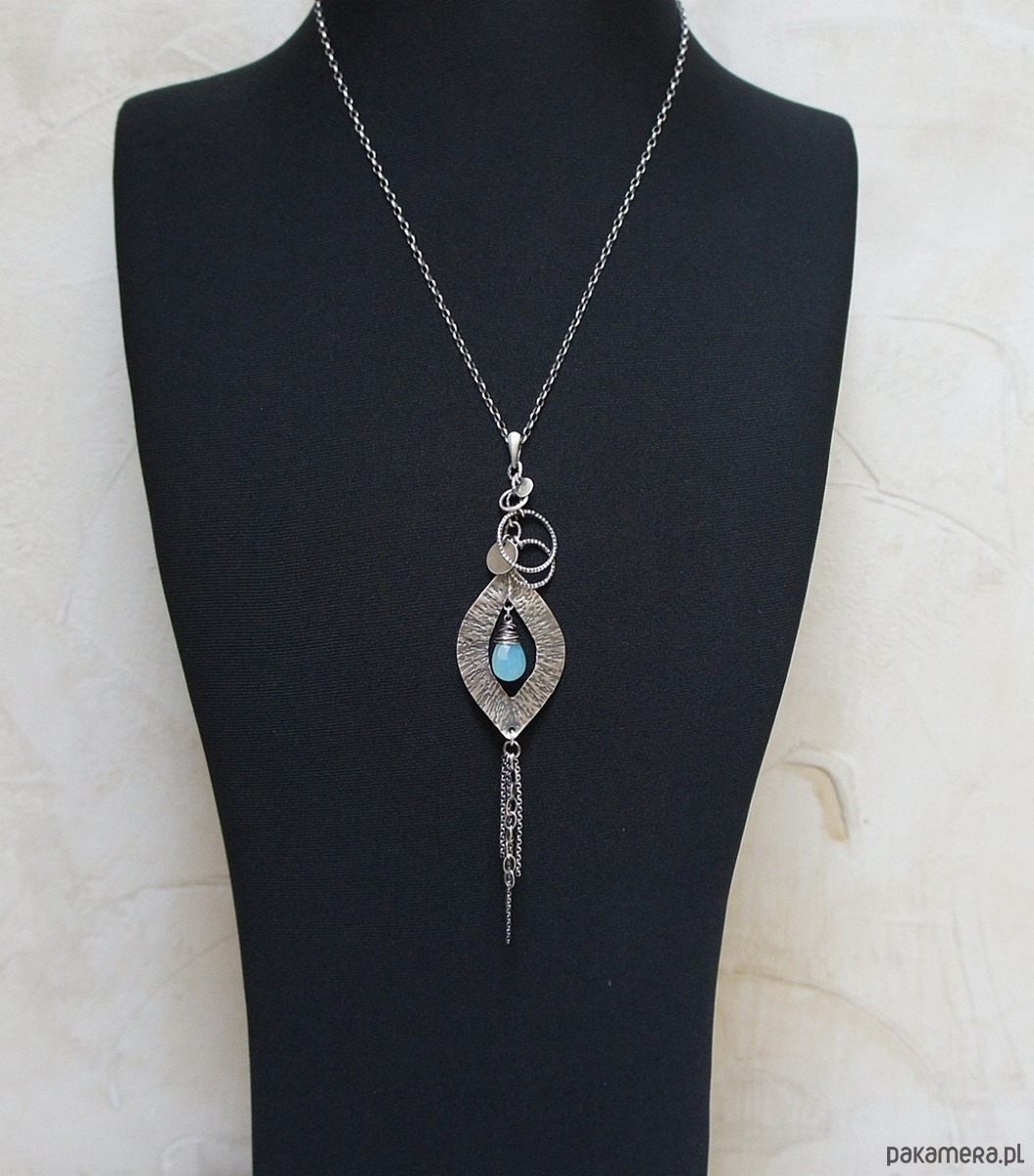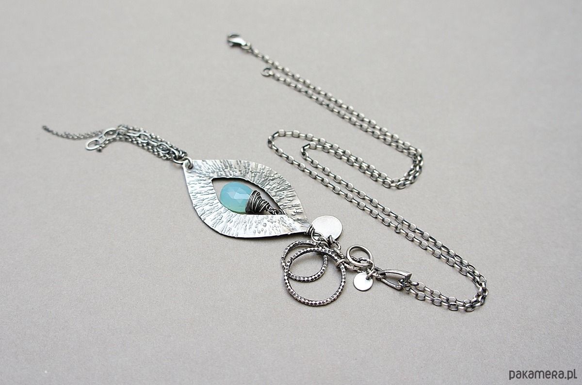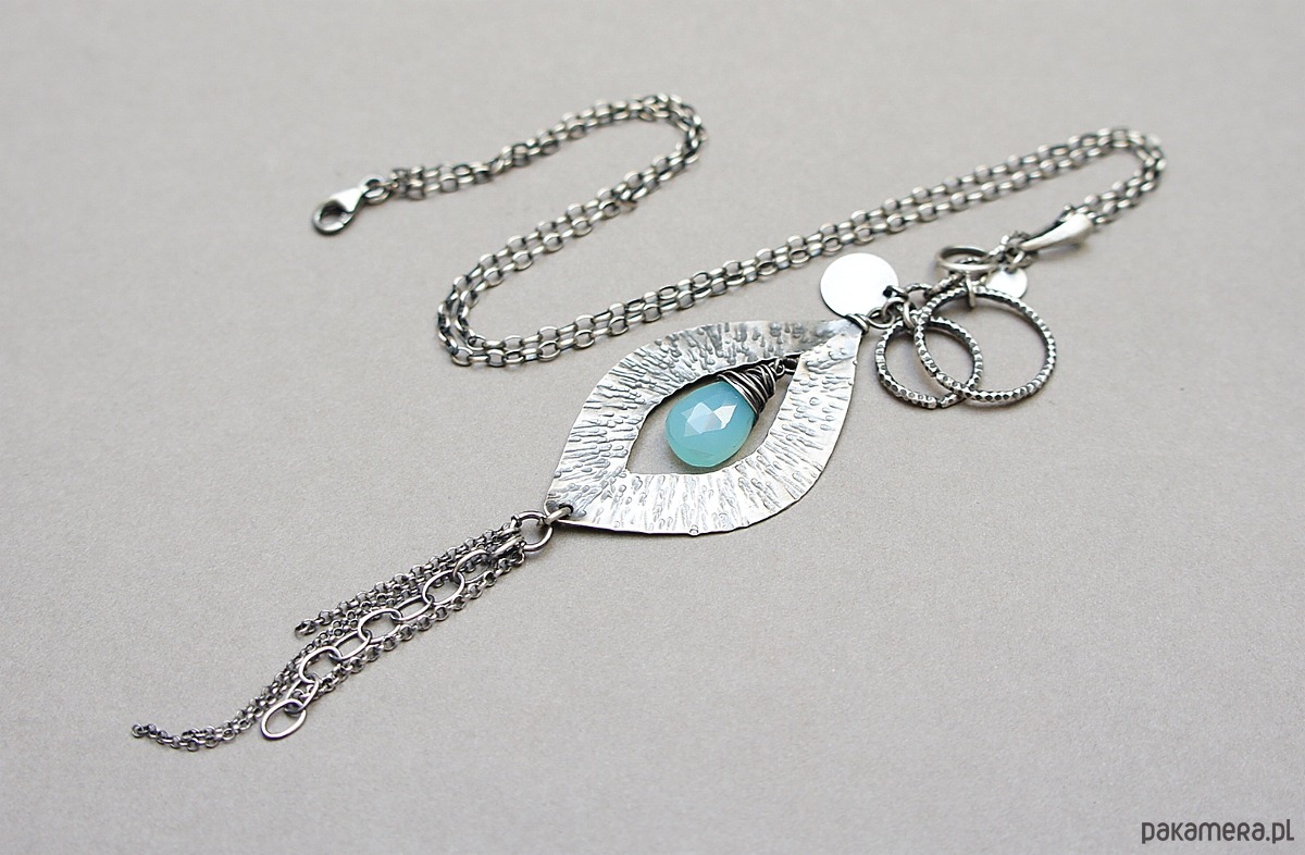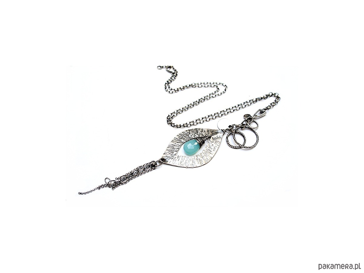 Naszyjnik wykonany własnoręcznie ze srebra [pr. 925] w połączeniu z fasetowaną cebulką chalcedonu [12mm] .Wielkość srebrnej markizy [50mm x30mm]. Srebro oksydowane i przetarte. Całkowita długość naszyjnika 50cm. Biżuteria ozdobnie zapakowana.