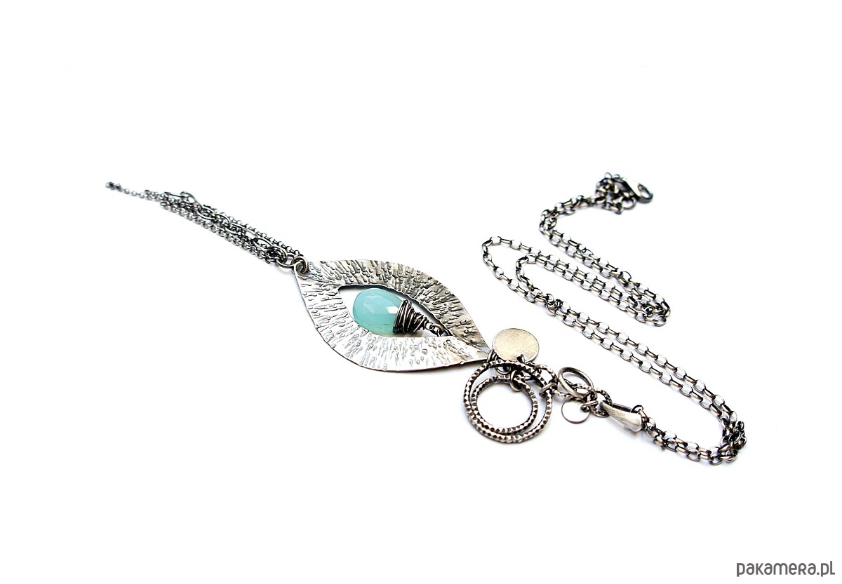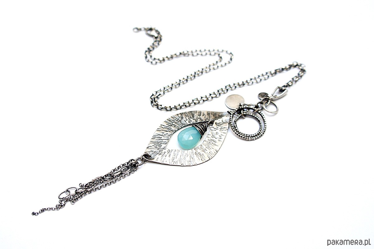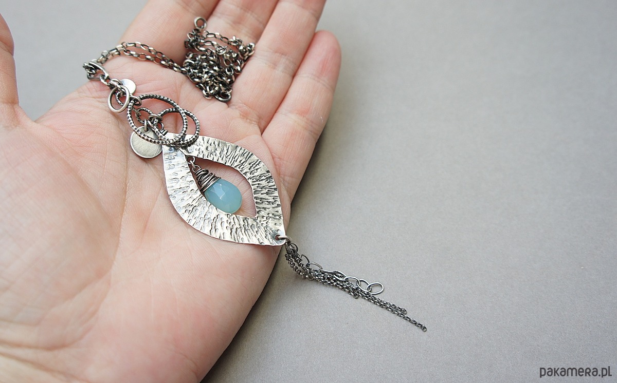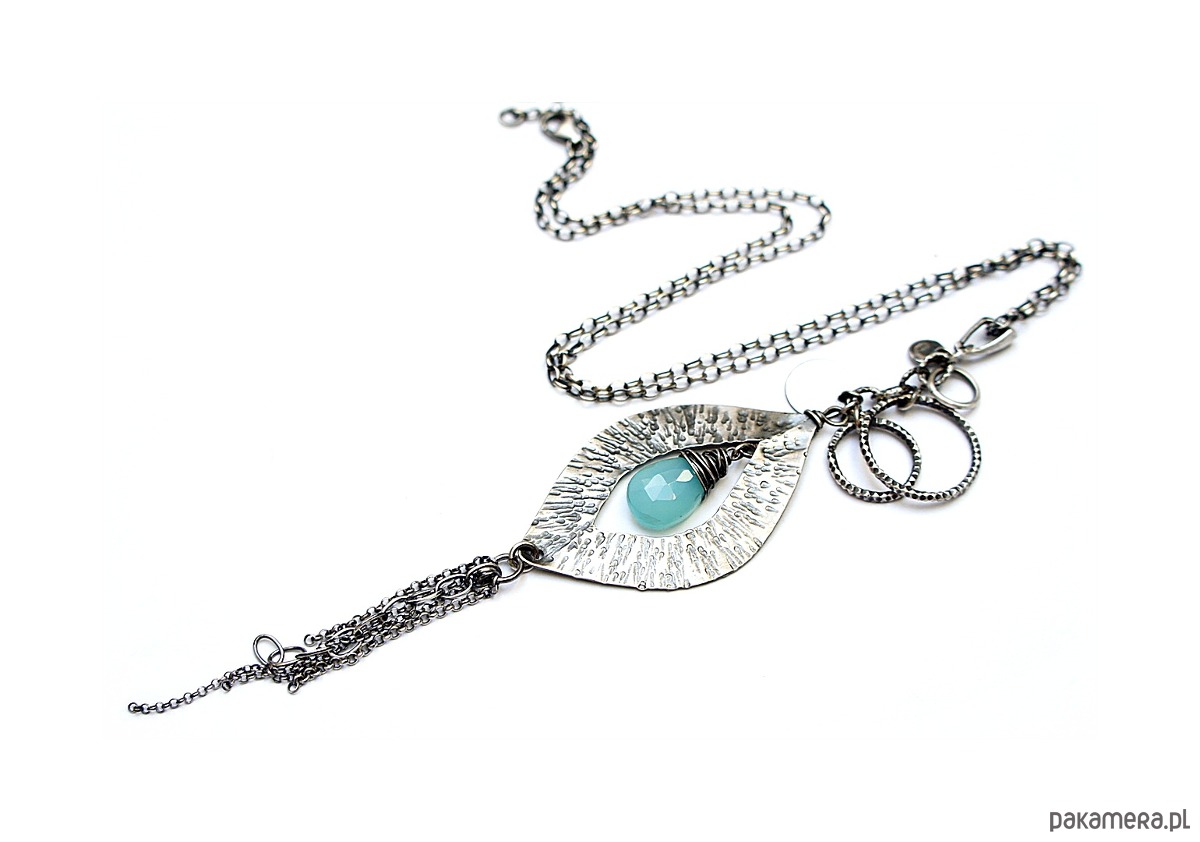 Naszyjnik wykonany własnoręcznie ze srebra [pr. 925] w połączeniu z fasetowaną cebulką chalcedonu [12mm] .Wielkość srebrnej markizy [50mm x30mm]. Srebro oksydowane i przetarte. Całkowita długość naszyjnika 50cm. Biżuteria ozdobnie zapakowana.