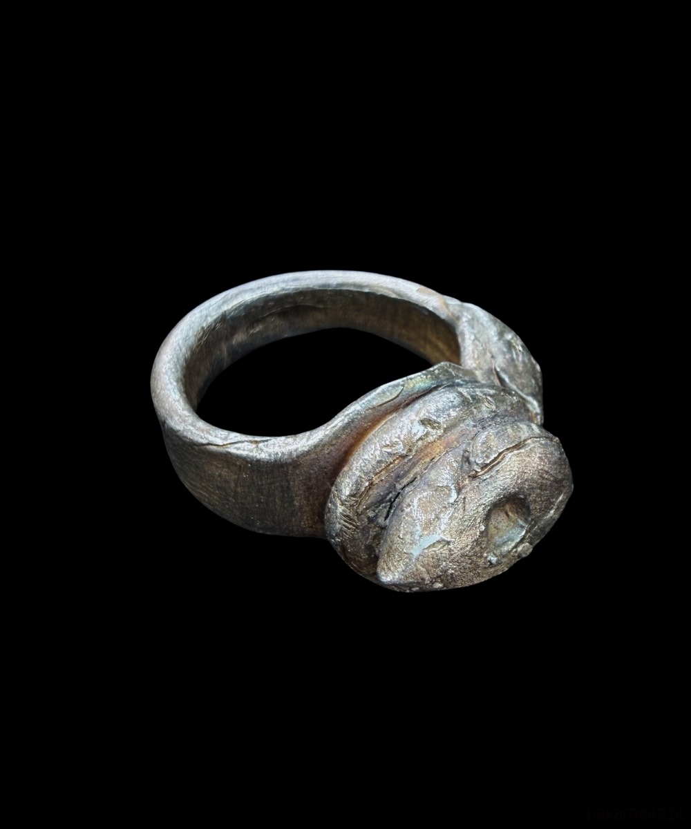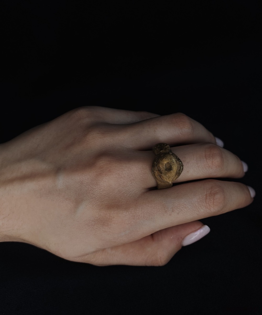 The ring is an extraordinary symbiosis of mystical beauty and ancient symbolism. It is hand-carved from silver, which has been intricately oxidized to gold, giving it a deep, warm luster. Its centerpiece is the shape of an eye, inspired by the legendary symbol of ancient Egypt - the Eye of Horus.