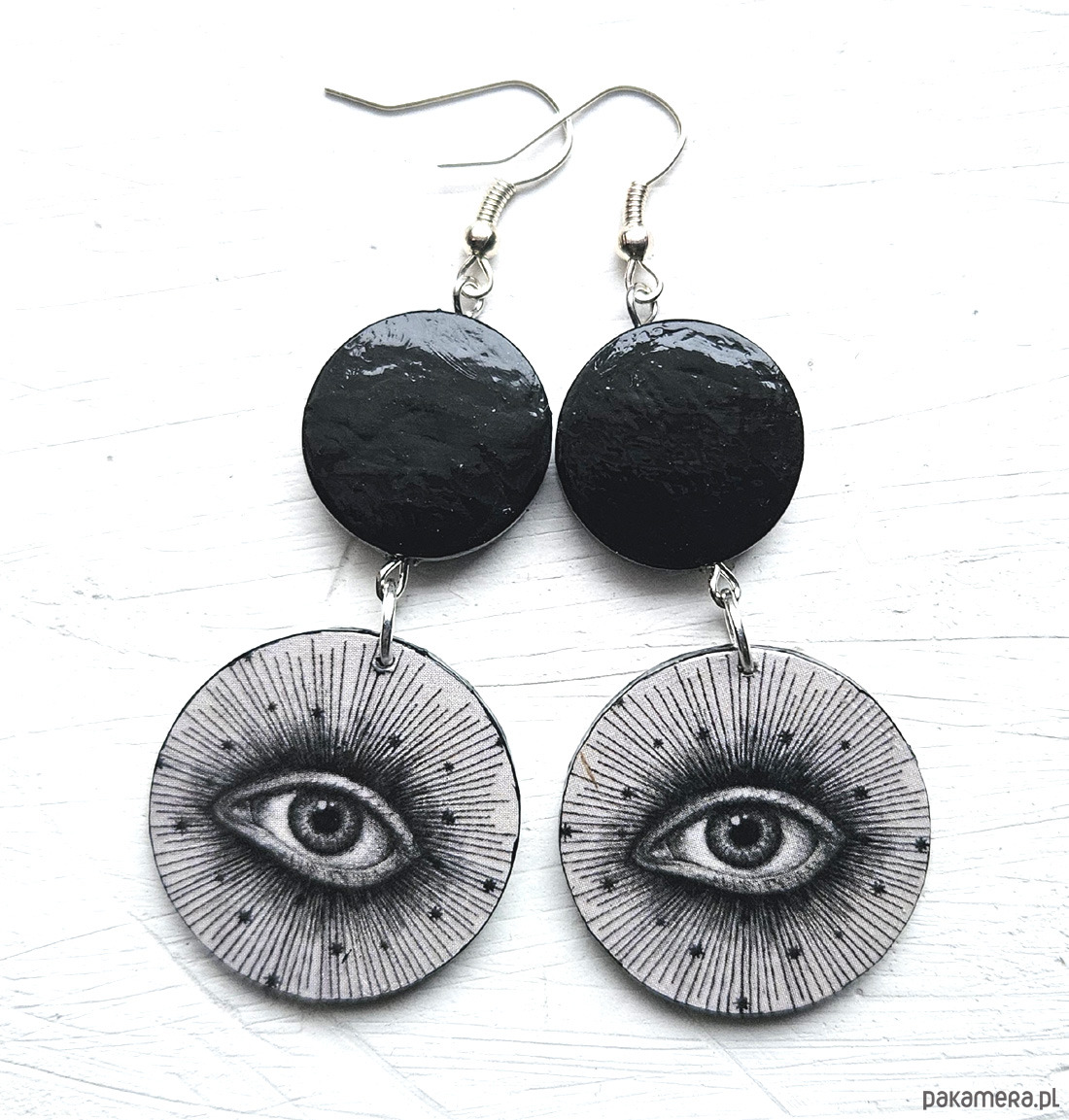 kolczyki drewniane, ozdobione metodą decoupage, dwustronne, starannie wykończone farbami akrylowymi i zabezpieczone wielokrotnie lakierem, bigle posrebrzane, długość kolczyków bez bigli: 6 cm, średnica: 3 cm i 2 cm, bardzo lekkie