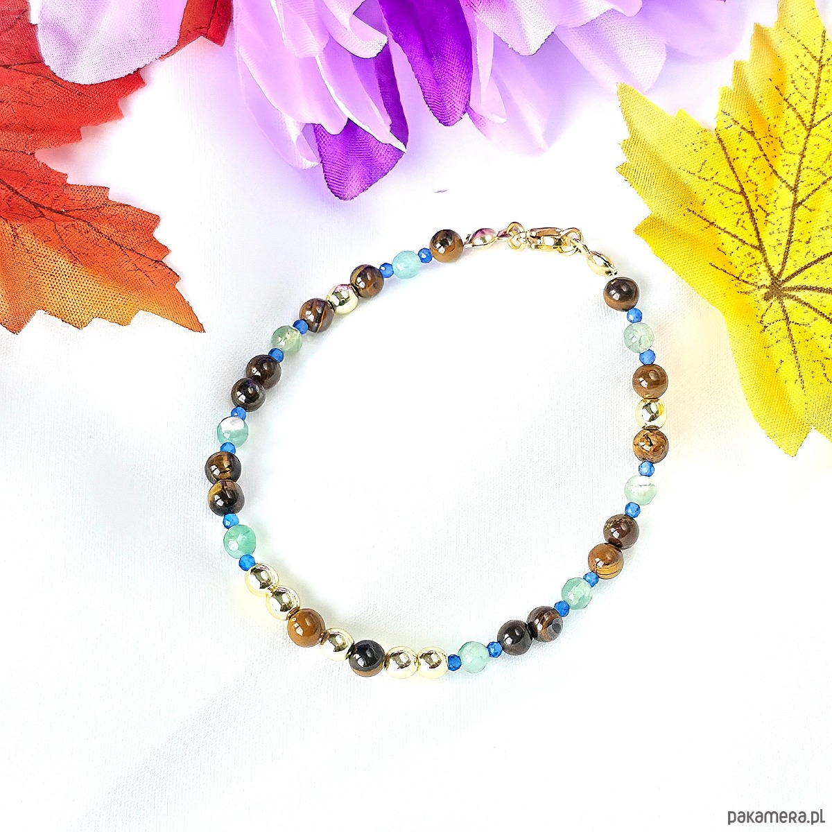 • Materiały : Tygrysie oko kula 4 mm, Hematyt jasnozłoty kula 4 mm , Kocie oko granatowe kulka fasetowana 2 mm , Agat zielony kulka fasetowana 4 mm, żyłka wędkarską transparentna