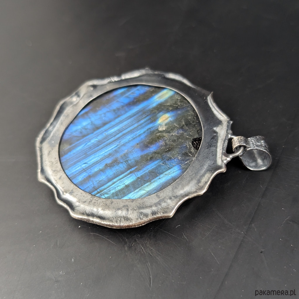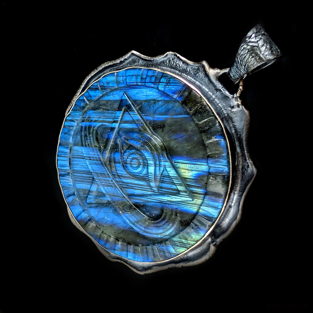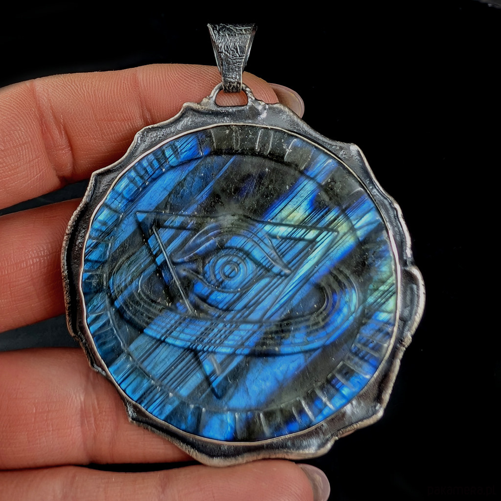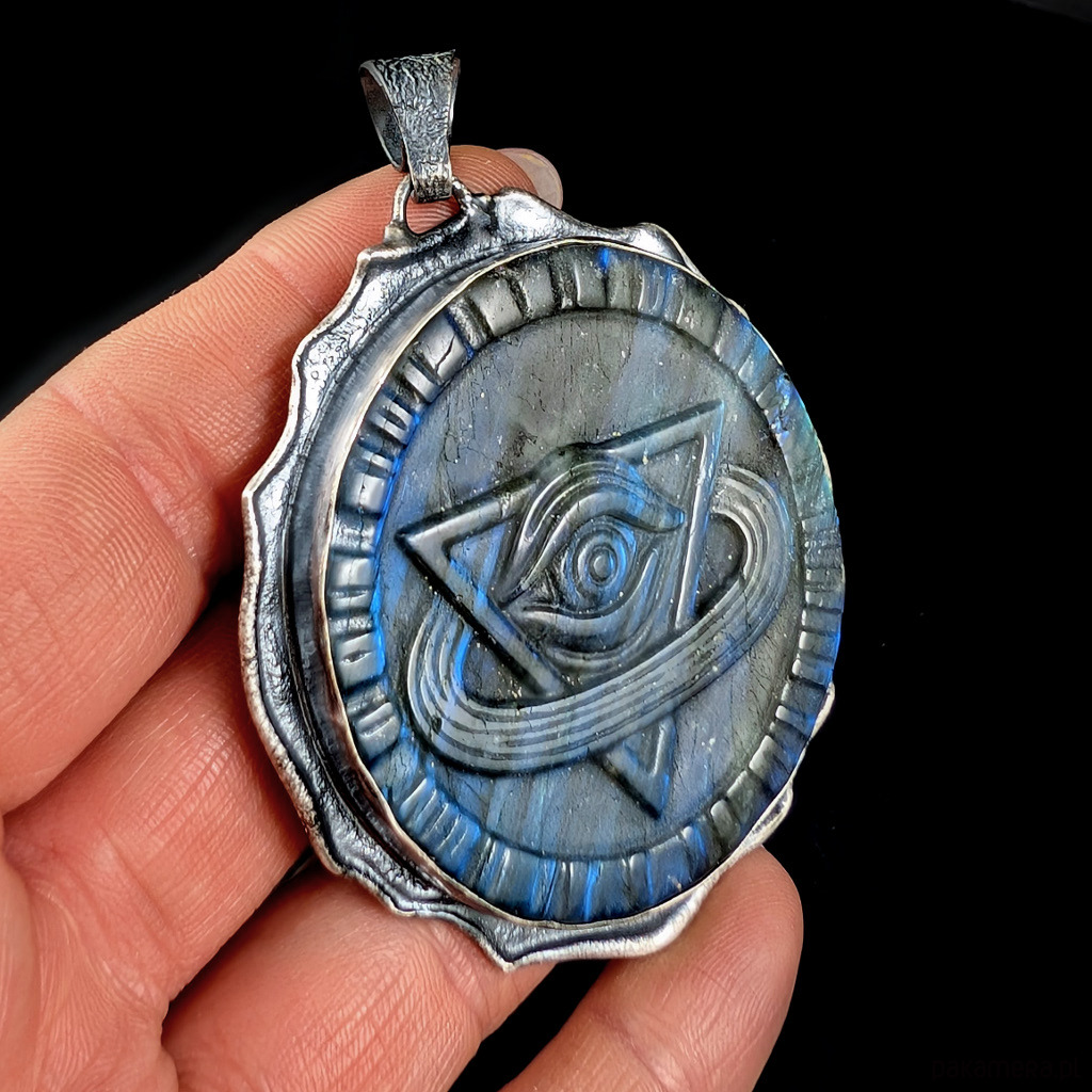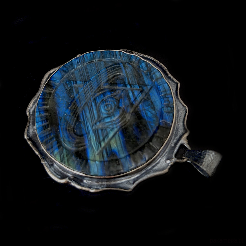 Bardzo okazały wisiorr z oksydowanego srebra próby 925 z oprawionym rzeźbionym w labradorycie symblicznym okiem. Średnica 55 mm, długość 69 mm. Waga 42 gramy. Zapakowany w ozdobne pudełeczko.