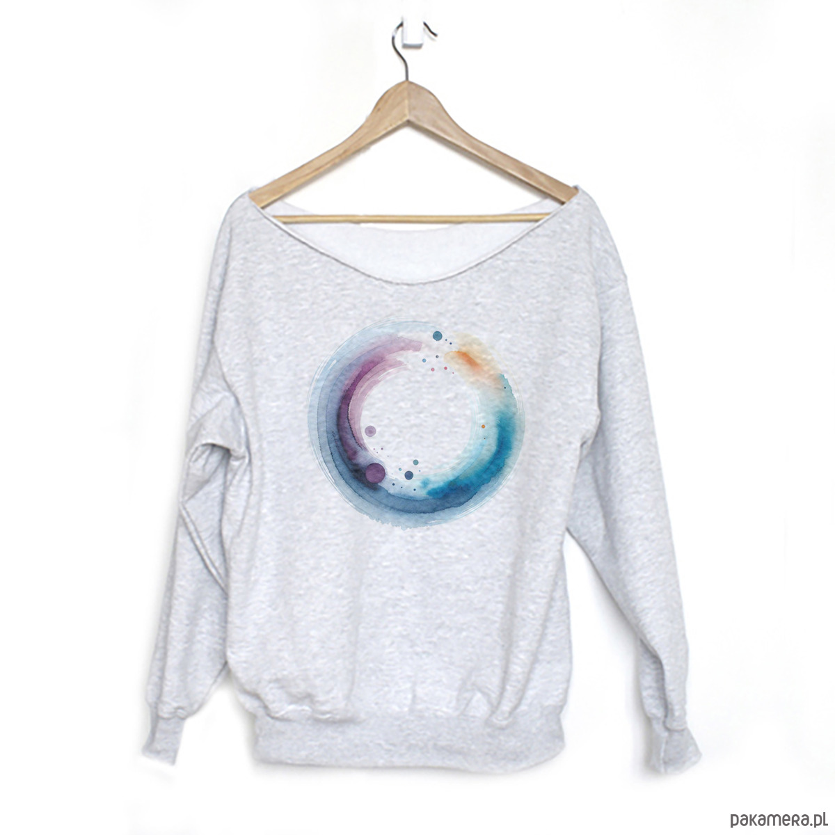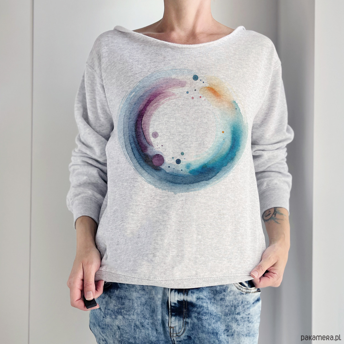 Nadruk cyfrowy. Szeroki dekolt. Cięte wykończenie dekoltu, zawija się w rurkę, rękawy i dół bluzy ze ściągaczami.