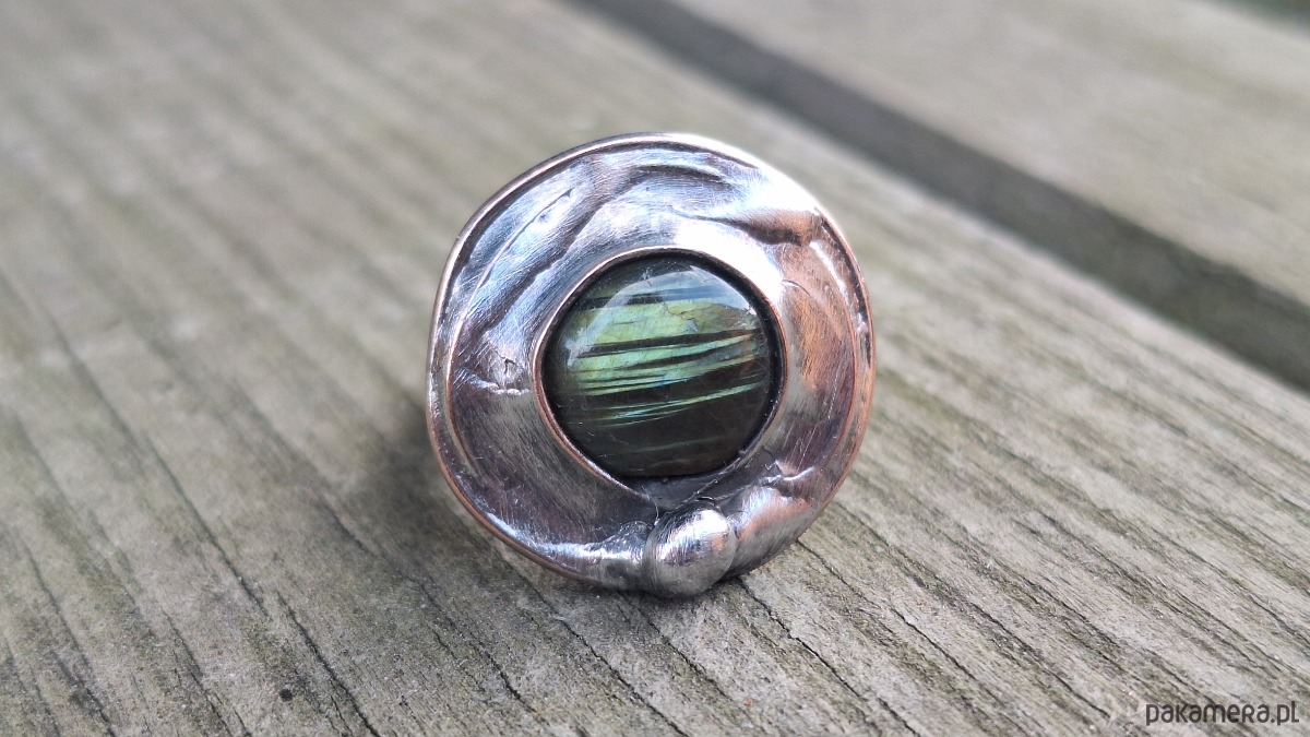 Pierścionek wykonany z miedzi, cyny i labradorytu. Wymiary ok. 2 na 2 cm. Regulowany. Nie jest ciężki.