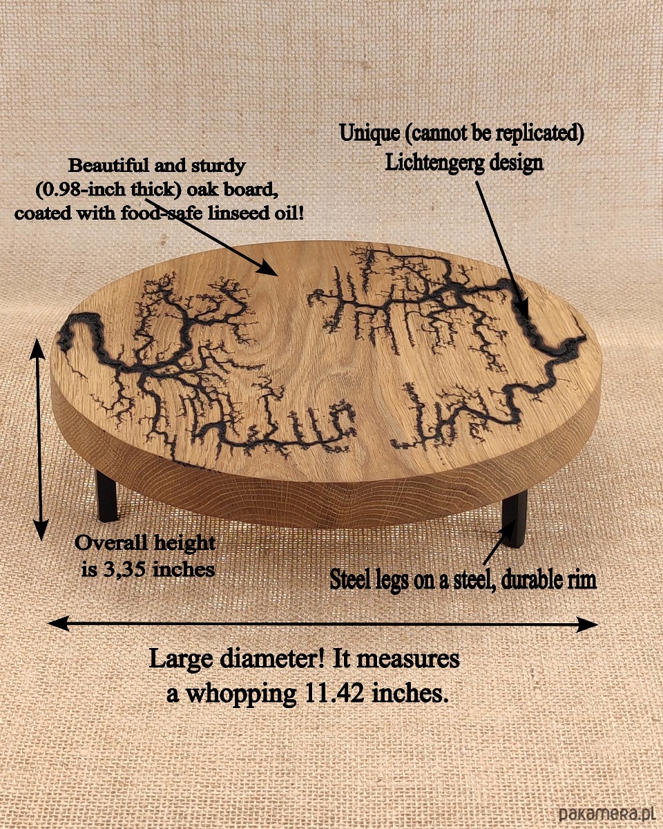 Wyobraź sobie, że nasza ręcznie wykonana deska z unikalnym wzorem Lichtenberga leży na Twoim stole, przychodzą goście, a na desce właśnie położyłaś wędliny, sery, świeży chleb. Jak opiszesz ich wrażenia?Wyjątkowość i personalizacja: Dzięki możliwości dodania własnego tekstu lub grafiki, tworzysz deskę, która jest niepowtarzalna i dopasowana do Twojego gustu. To jedyne w swoim rodzaju artystyczne dzieło. Wzór, dzięki naszej technice wykonania, nigdy się nie powtarza. Jest absolutnie unikalny.Unikalność stylu: Deska wykonana z solidnego drewna dębowego zapewnia nie tylko piękno, ale także trwałość. To doskonały dodatek, który będzie służył Ci przez wiele lat, zachowując swój unikalny wygląd, pokaże Twój styl i wyjątkowy gust oraz zamiłowanie do natury.Doskonały wybór na prezent: Dzięki wyjątkowemu designowi i personalizacji, staje się idealnym upominkiem na różne okazje, takie jak otwarcie nowego domu, urodziny, święta czy Dzień Matki. To prezent, który nie tylko urozmaici wnętrze, ale także wywoła uśmiech i zapewni wiele pięknych chwil. Bezpieczna dla zdrowia: Deska jest pokryta jadalnym olejem lnianym, co zapewnia bezpieczeństwo potraw i łatwą samodzielną konserwację - można ją ręcznie umyć wodą, i w razie potrzeby ponownie pokryć olejem. Masz pewność, że zdrowie Twoje i Twojej rodziny jest bezpieczne.Ten wzór już się nie powtórzy NIE ZWLEKAJKup teraz