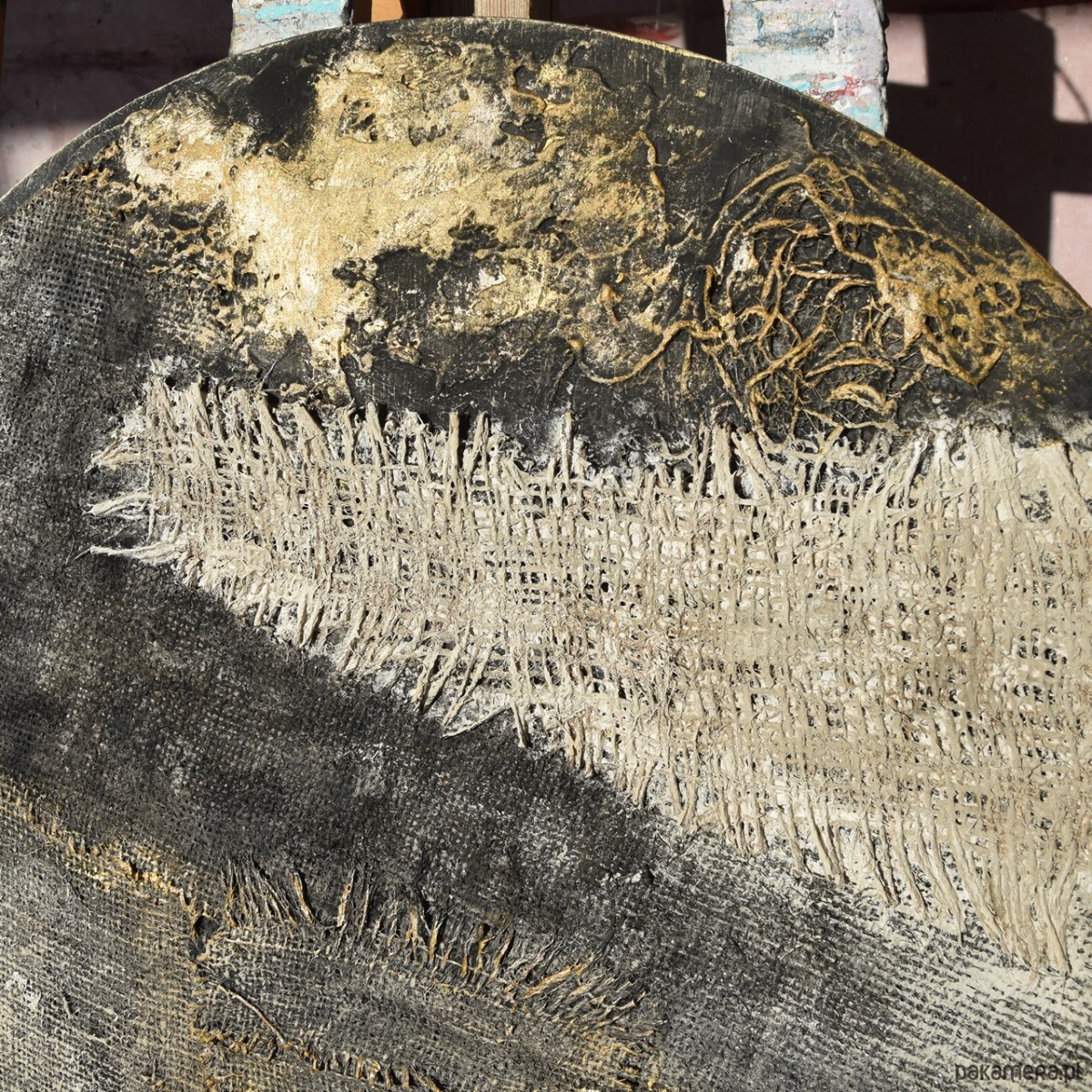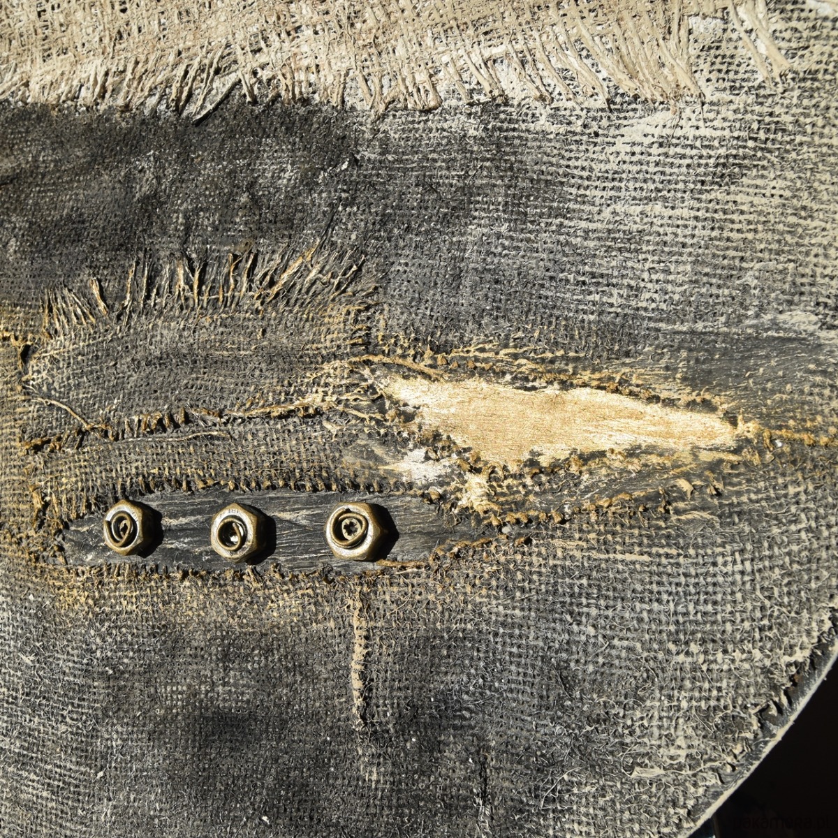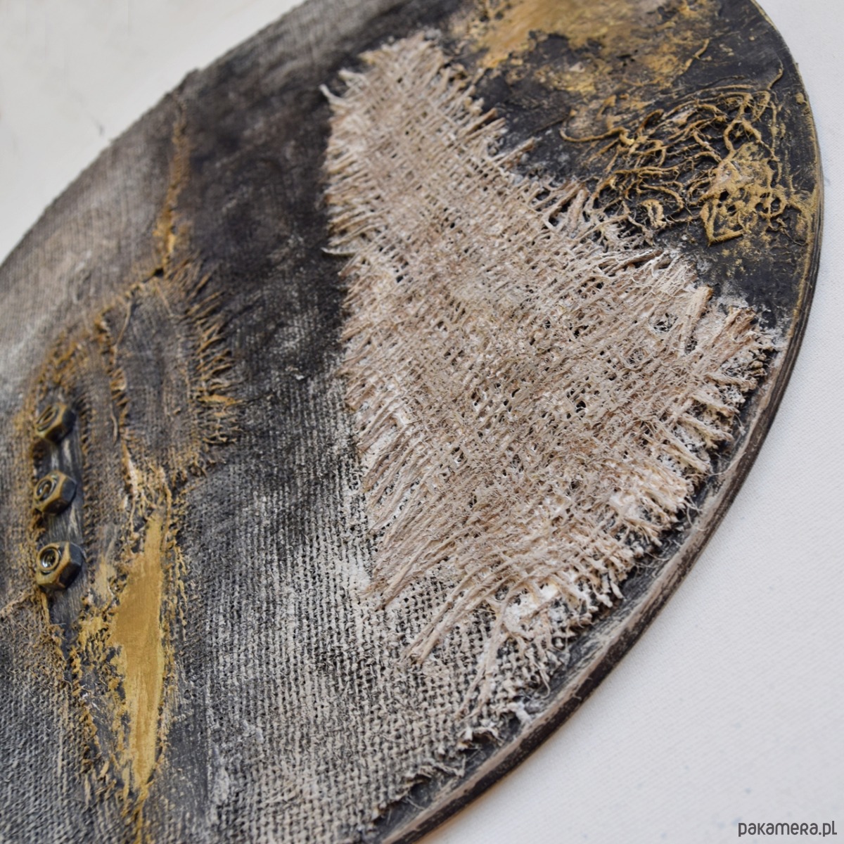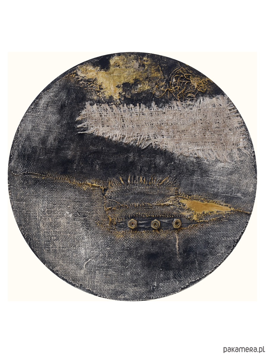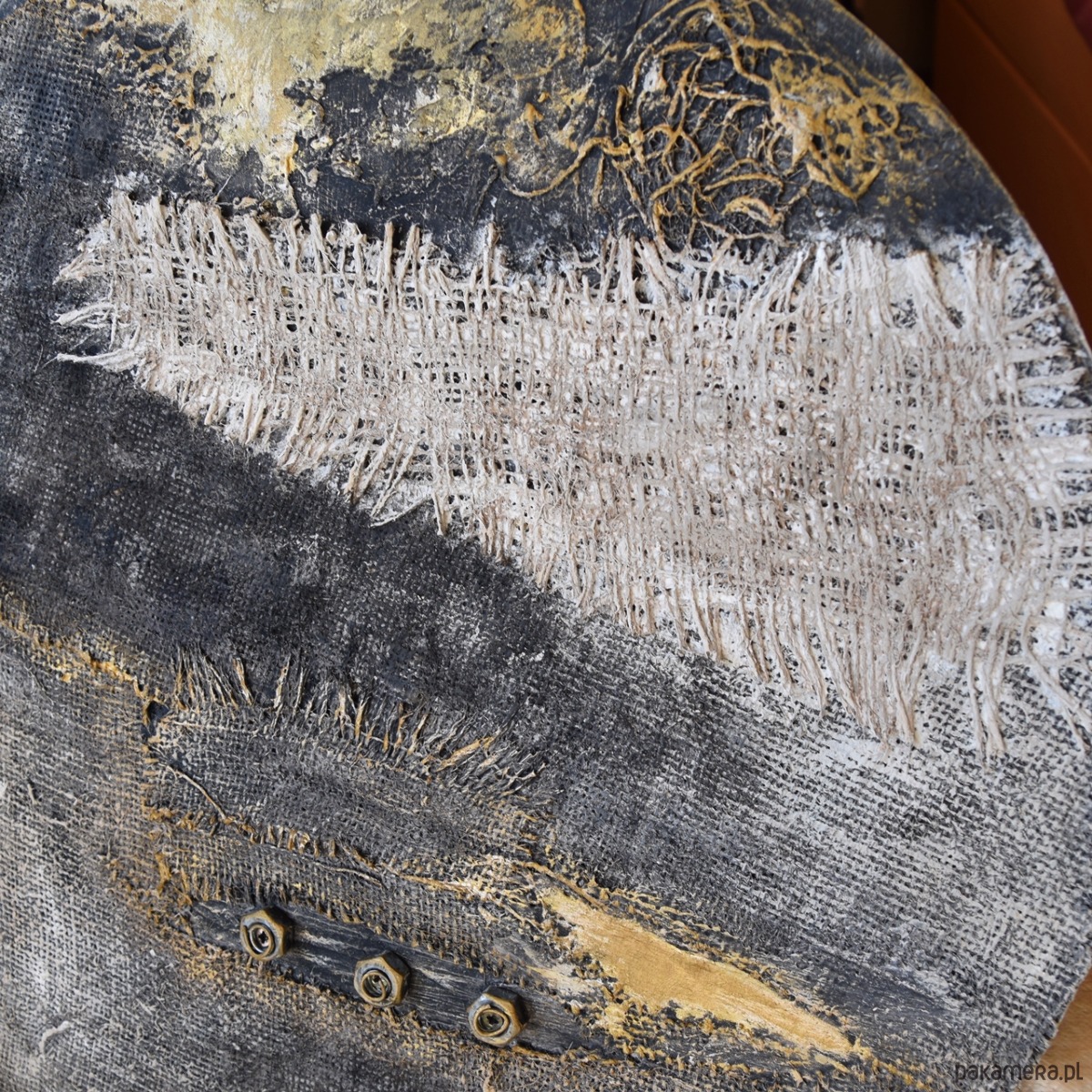 Dekoracja - obraz ręcznie malowany w technice mieszanej - przyklejane elementy z juty, elementy w stylu industrialnym, masa strukturalna, malowany farbami akrylowymi, w tym częściowo przecierany metaliczną farbą złotą. Wykonany na sztywnej sklejce o grubości 8 mm - jest to sklejka pochodząca ze starych szpul, a jej wykorzystaniem dekoracja nawiązuje do idei twórczego recyklingu.