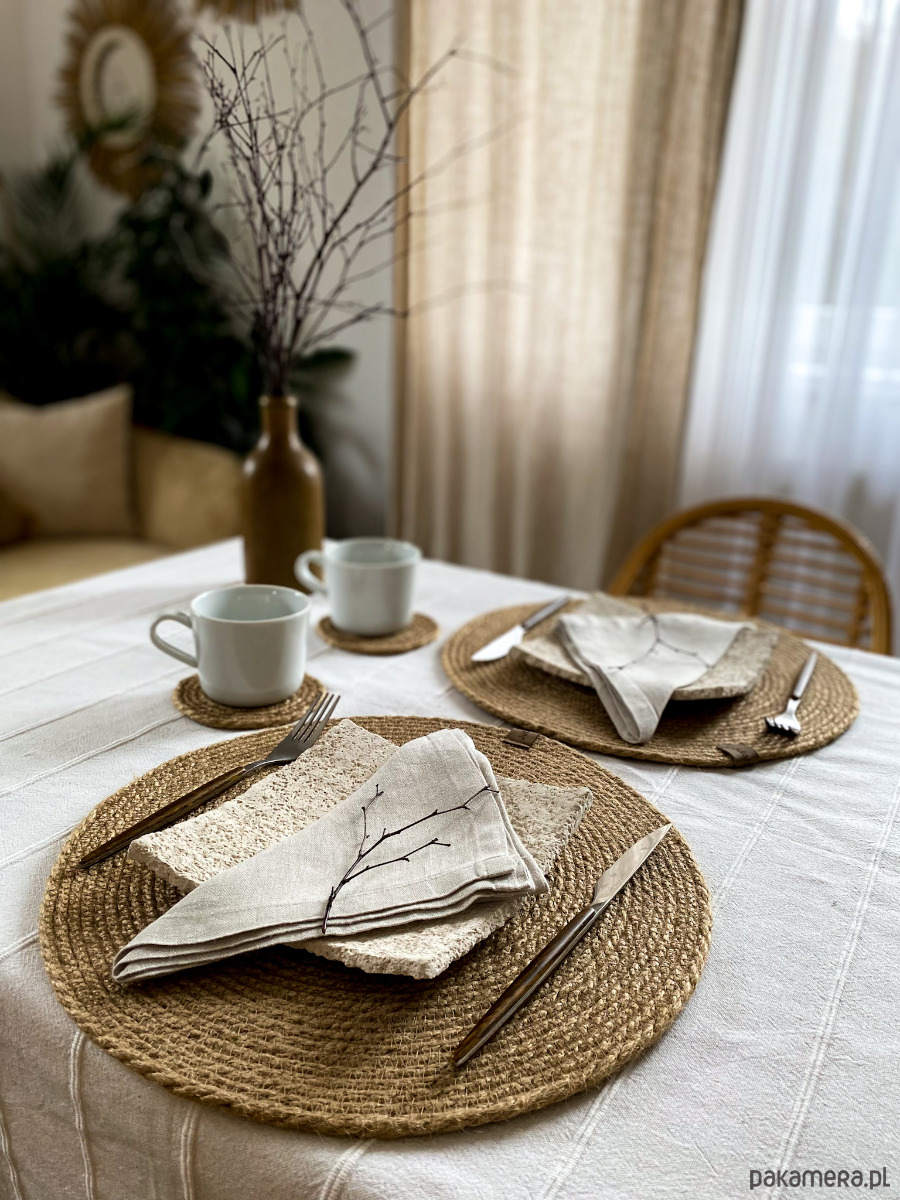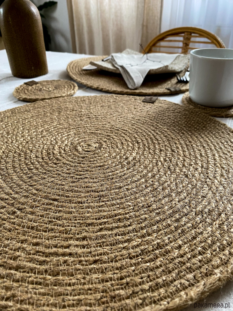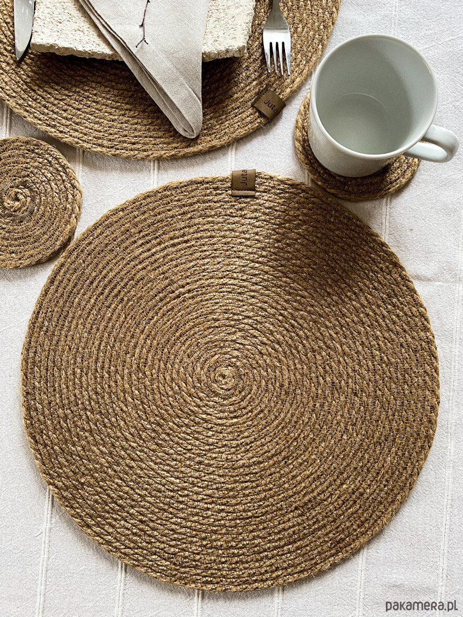 Pojedyńcza podkładka z juty może stanowić codzienną dekorację na stoliku kawowym w salonie.