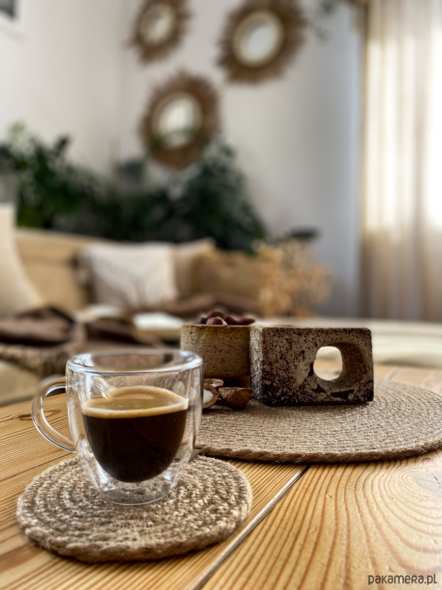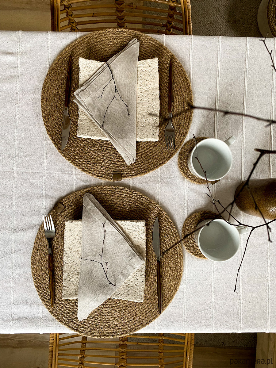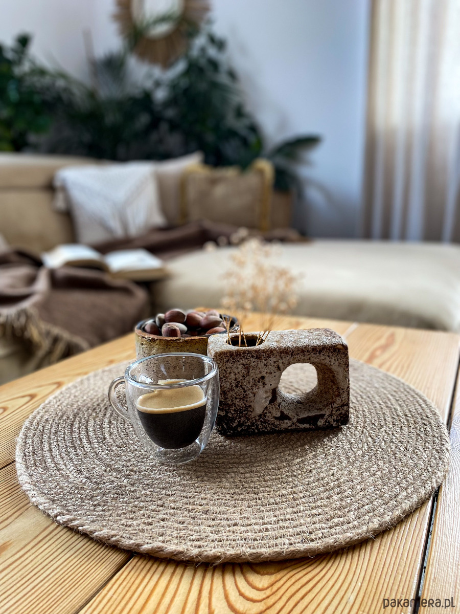 Pojedyńcza podkładka z juty może stanowić codzienną dekorację na stoliku kawowym w salonie.