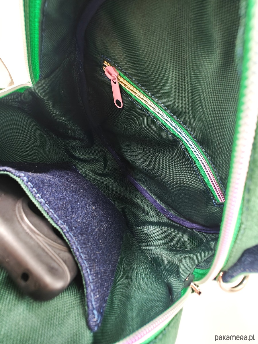 - Wewnątrz: solidna, wodoodporna podszewka, a w niej dedykowana kieszonka na telefon oraz dodatkowa kieszeń na zamek.
