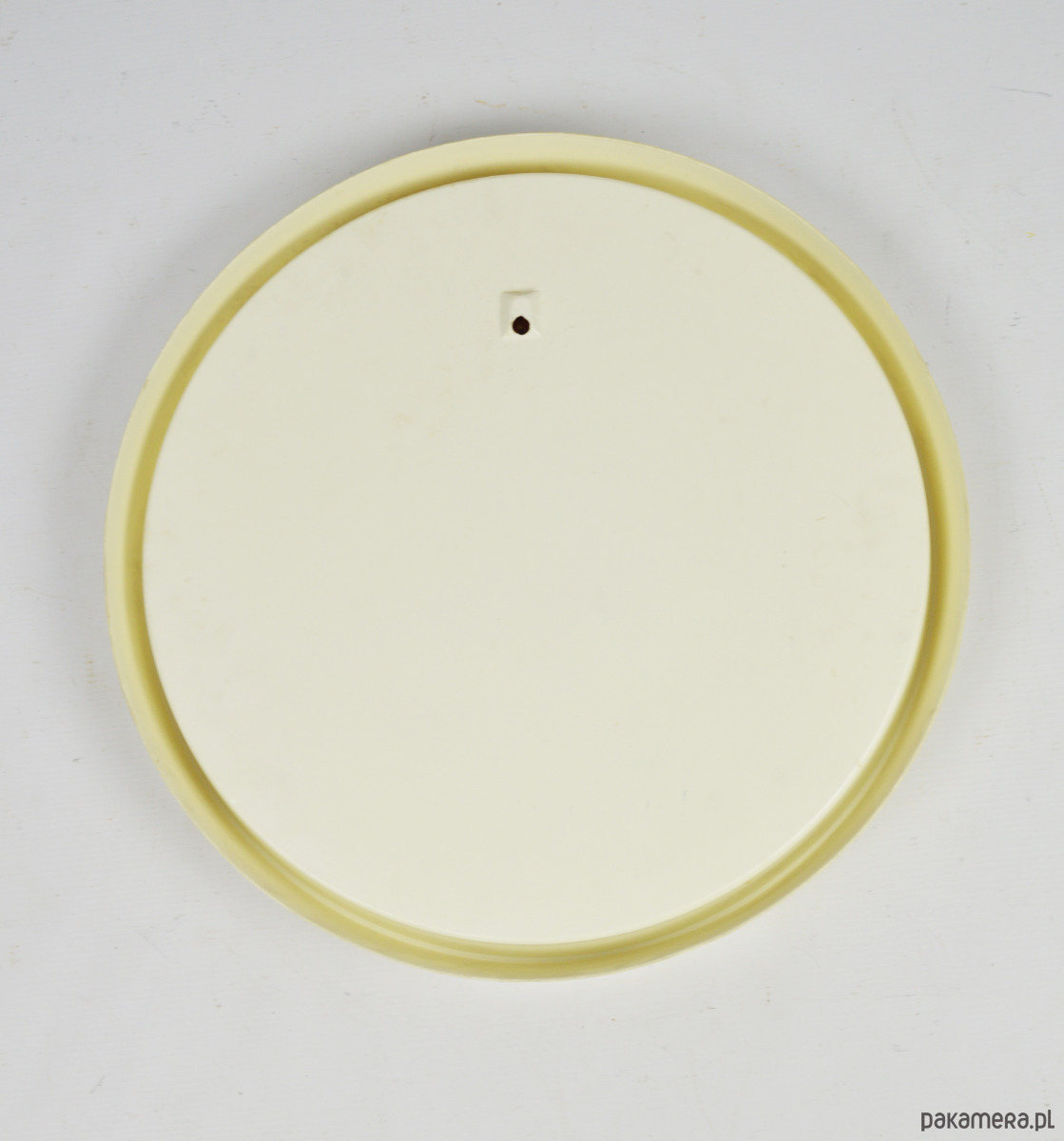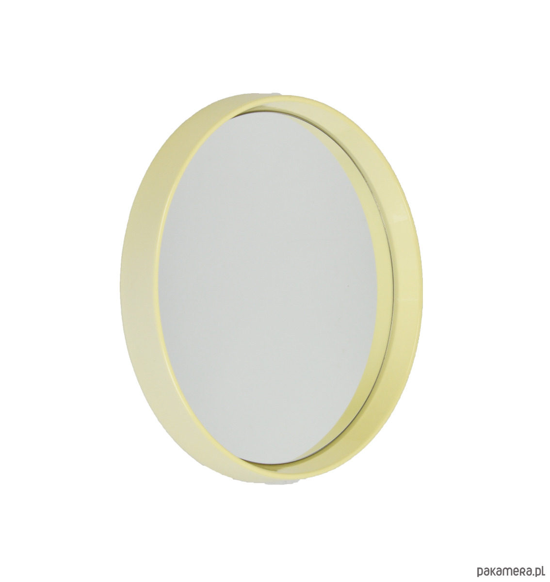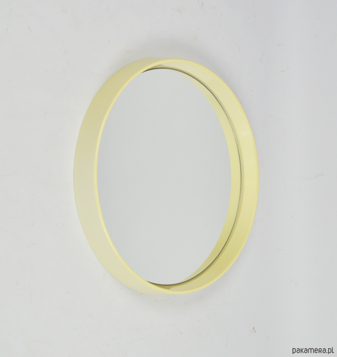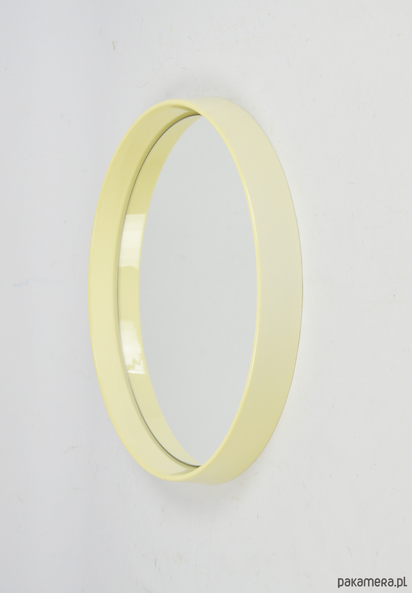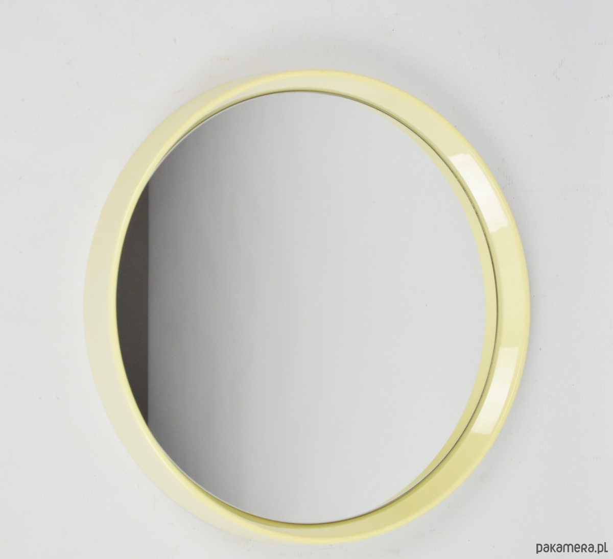 Okrągłe lustro w głębokiej ramie wykonanej z tworzywa z lat 70. Stan zachowania dobry, widoczne normalne ślady użytkowania, rysy i otarcia na ramie.