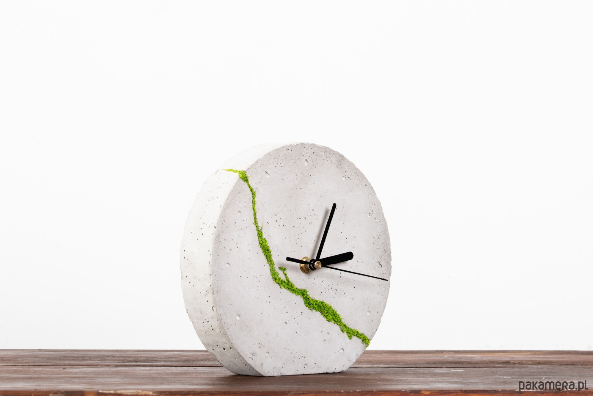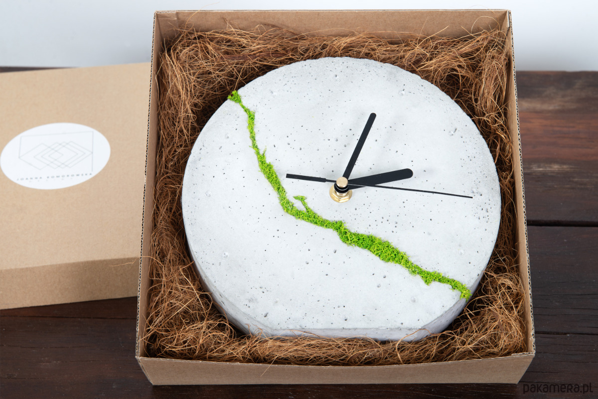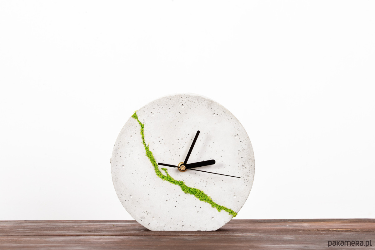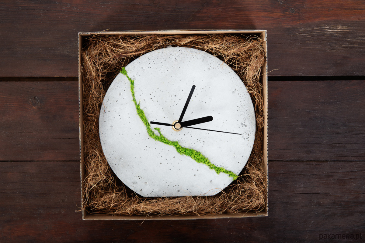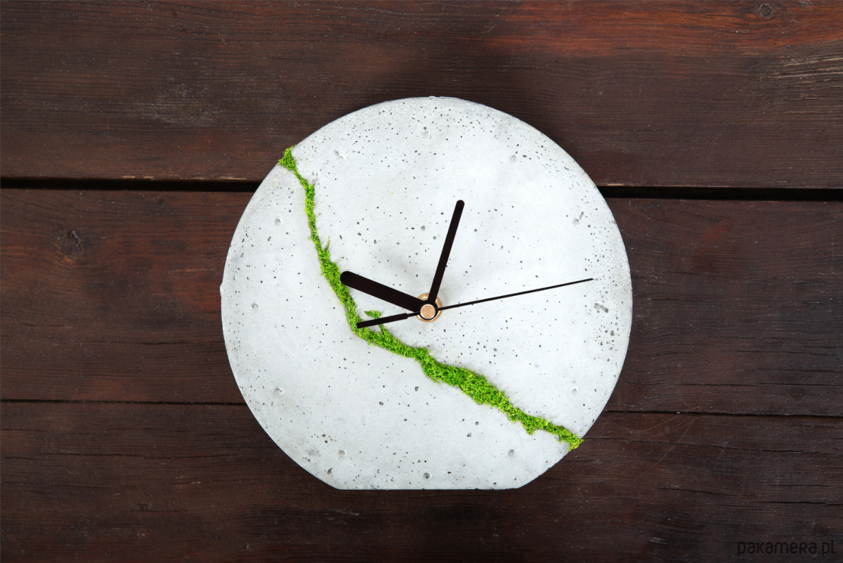 Zegar ręcznie wykonany z betonu architektonicznego w naturalnym kolorze, z chrobotkiem reniferowym umieszczonym w szczelinie imitującej pęknięcie. Wielkość około 20x20x4 cm.