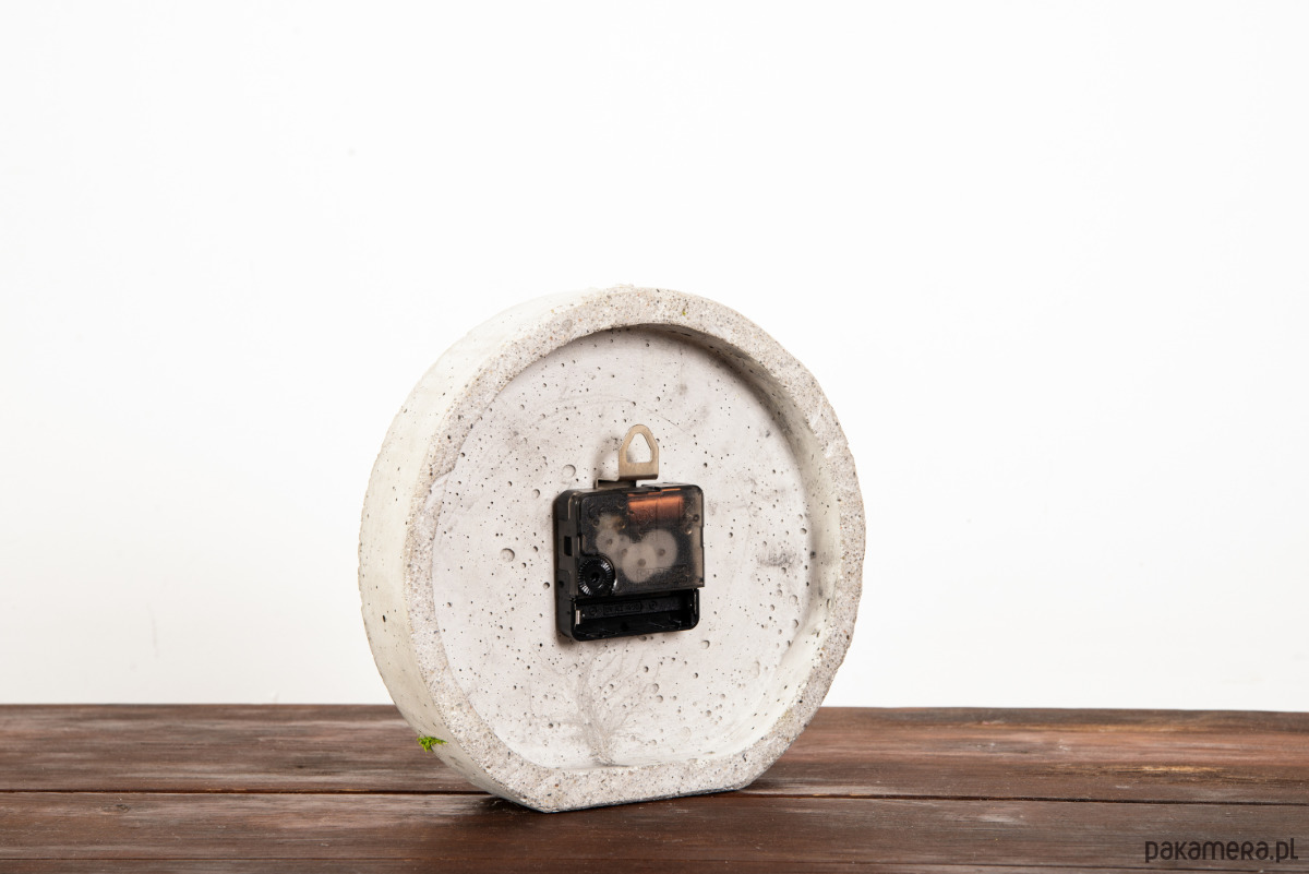 Zegar z betonu architektonicznego z chrobotkiem reniferowym.