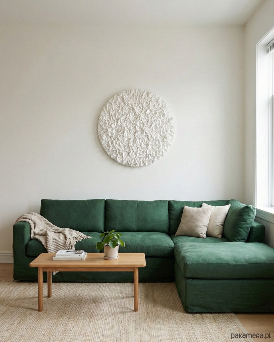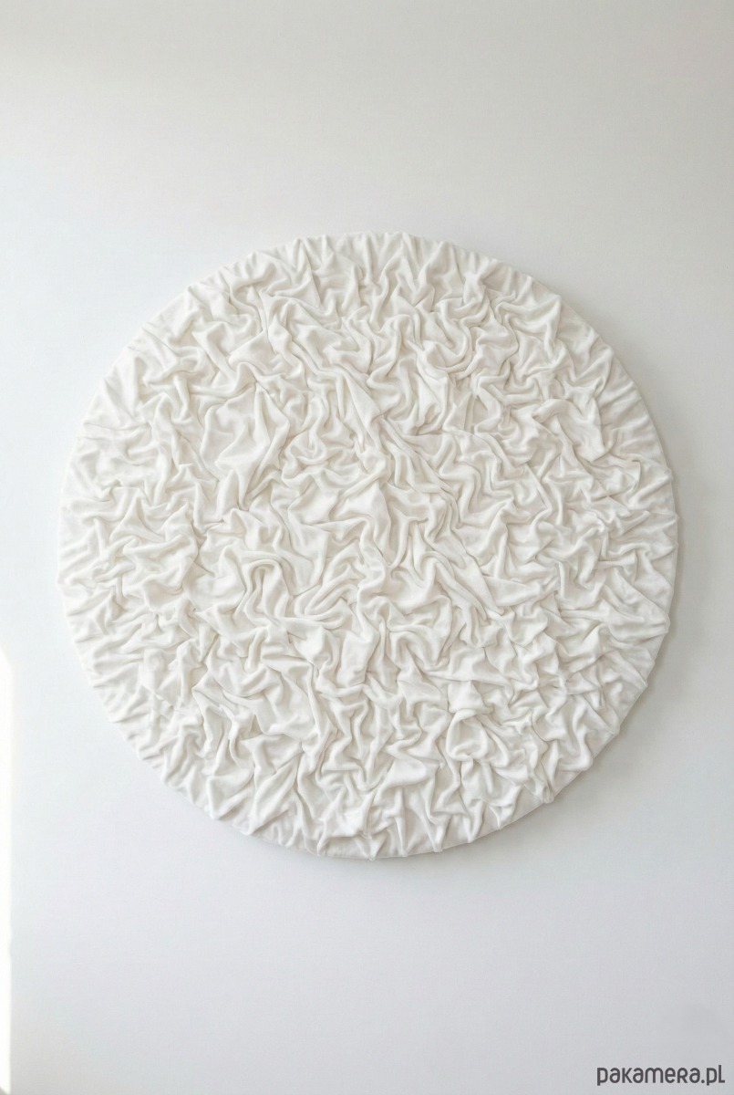 Ręcznie wykonany, nowoczesny okrągły obraz ścienny stworzony z formowanej i usztywnionej tkaniny w sposób bezpieczny oraz trwały. Powierzchnia obrazu opiera się na rytmie zagnieceń, światłocieniu i głębi faktury. Każdy fragment inaczej reaguje na światło, tworząc dynamiczną, ale spokojną całość.