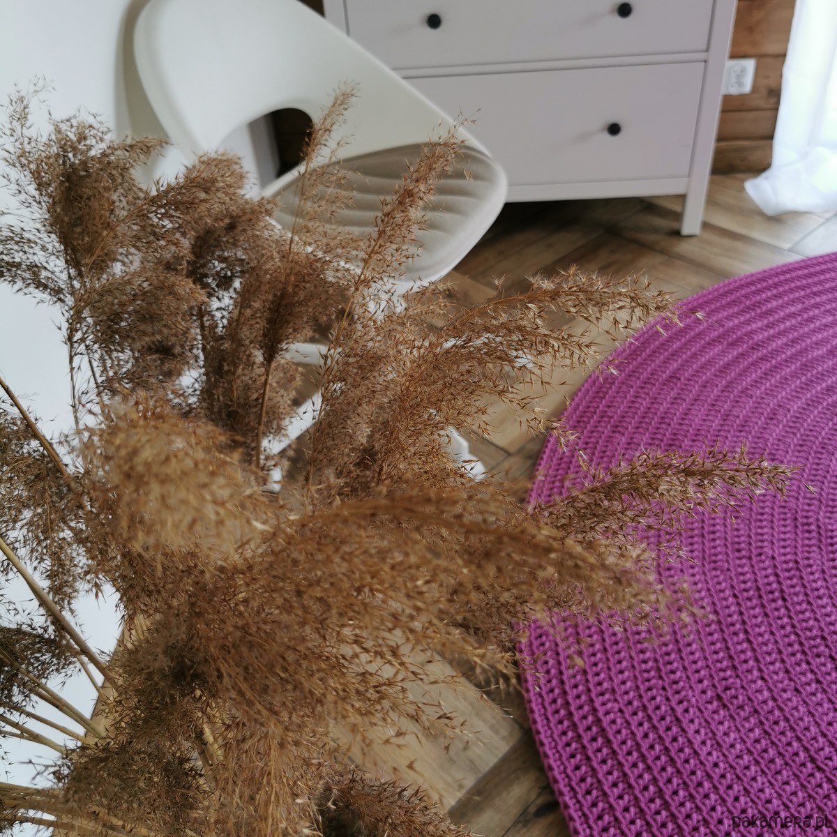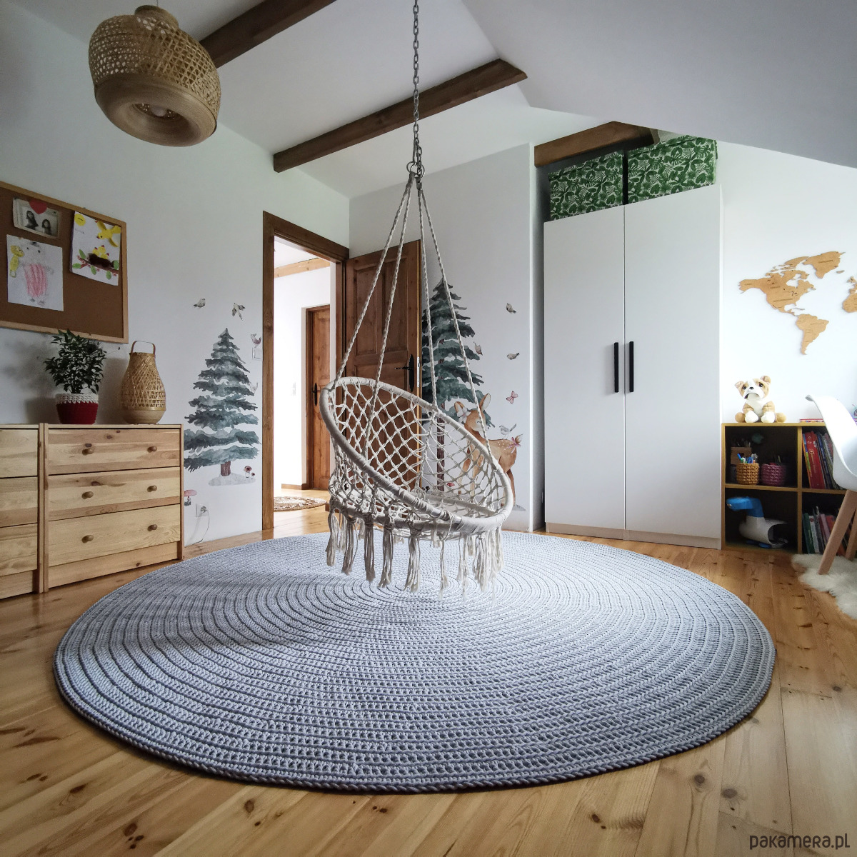 Ręcznie wykonany okrągły dywan z grubego sznurka bawełnianego o średnicy 5mm.