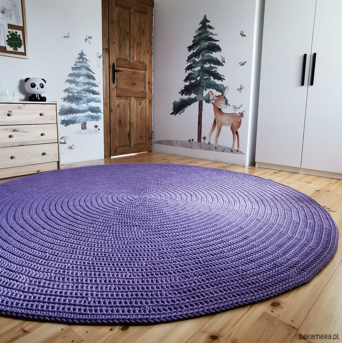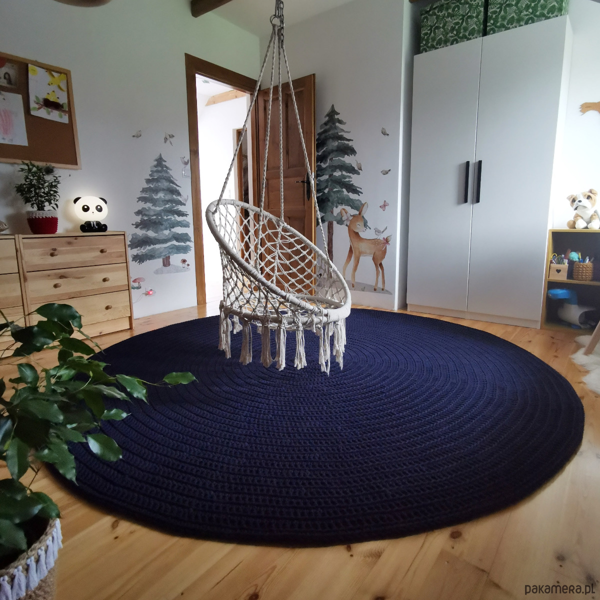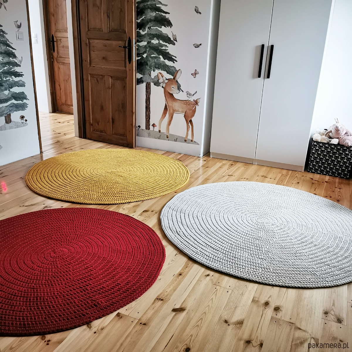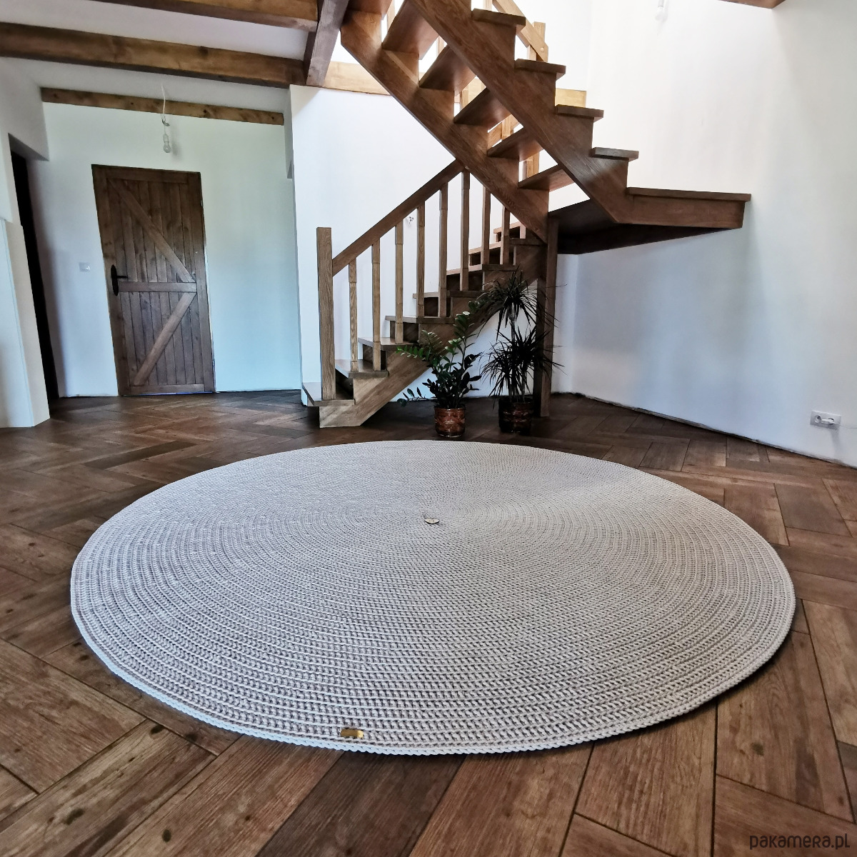 Ręcznie wykonany okrągły dywan z grubego sznurka bawełnianego o średnicy 5mm.