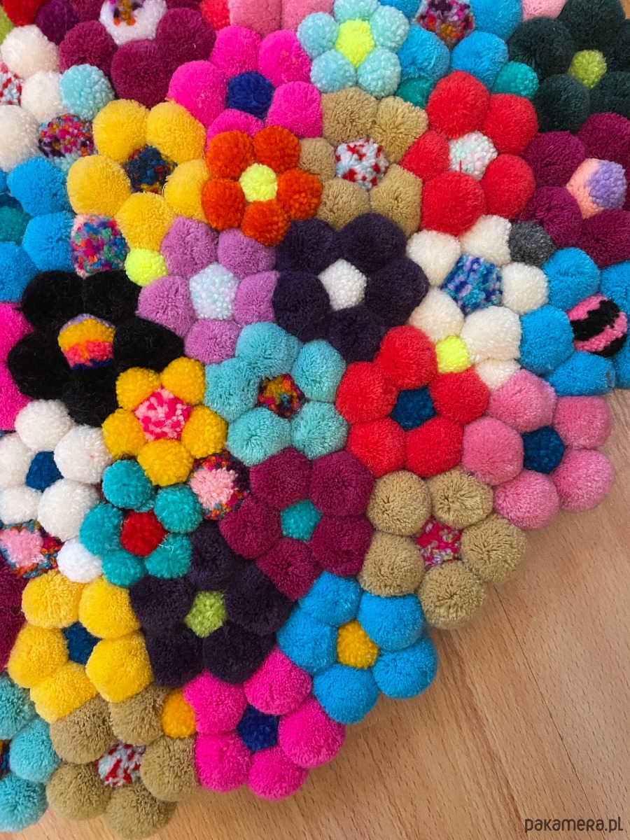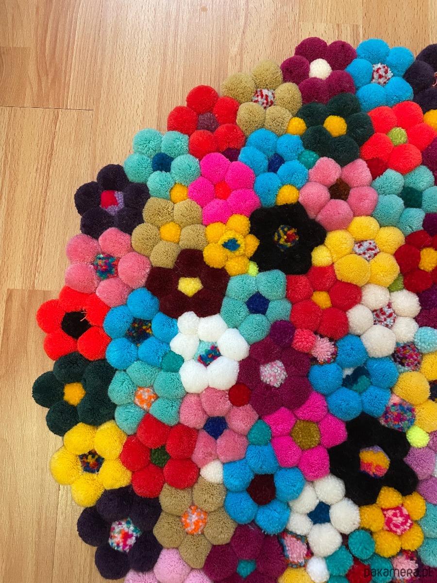 Różnokolorowe kwiaty z pomponów, dekoracja a zarazem relaksujący dywanik do sypialni lub łazienki.