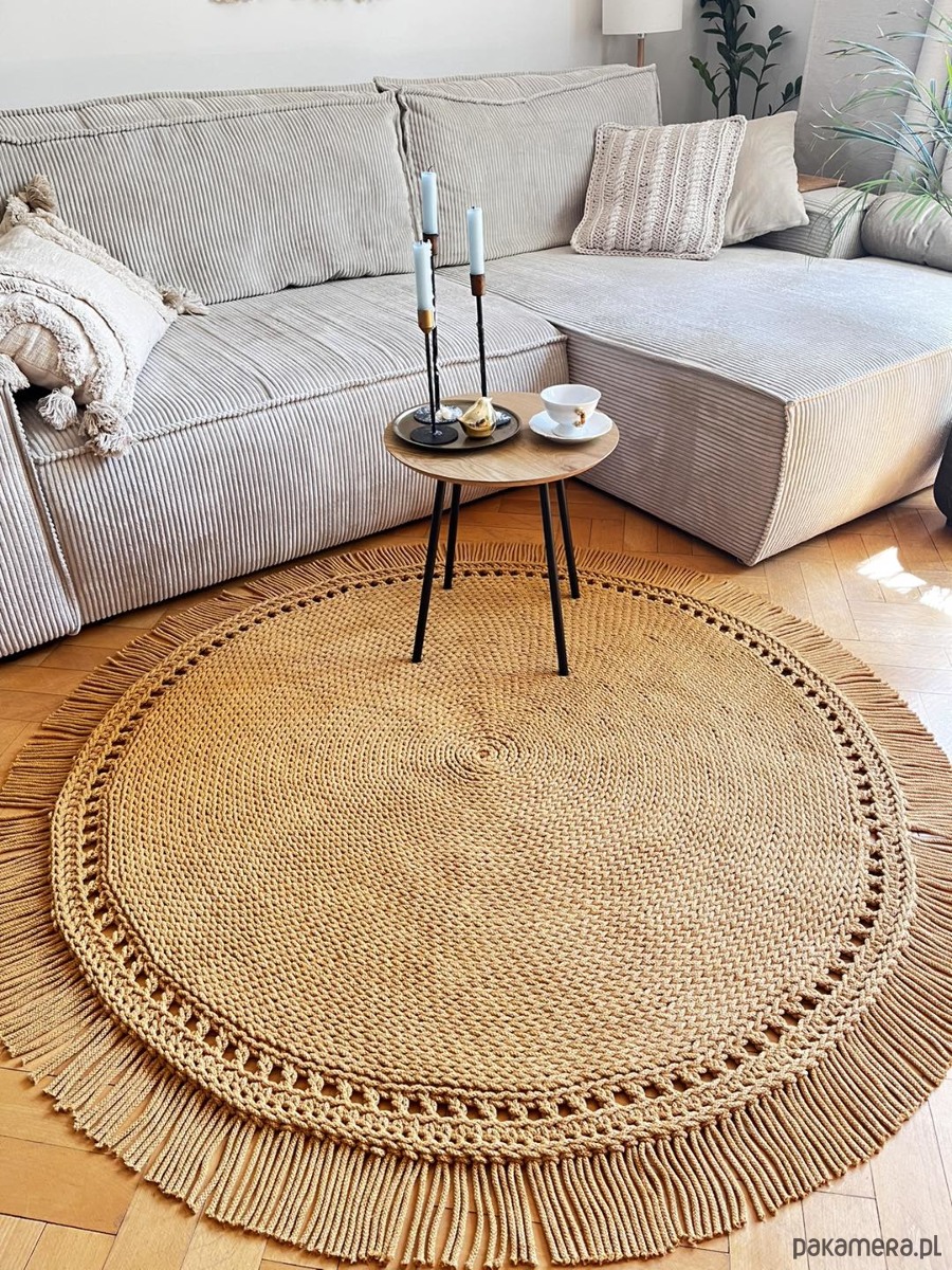 Okrągły dziergany dywan Boho Musztrarda 140 cm