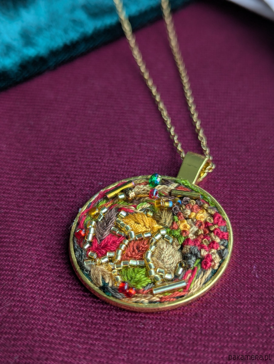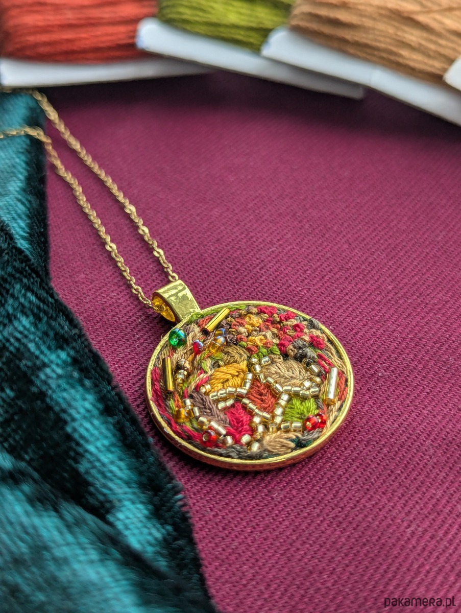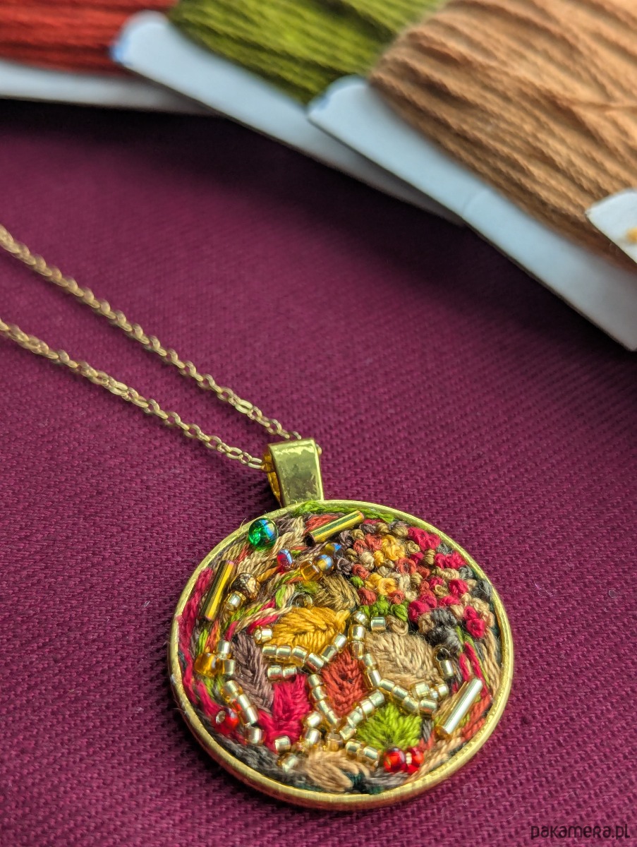 Wyhaftowałam go mulinami w jesiennych kolorach. Wśród nich pojawiają się błyszczące koraliki w różnych barwach.