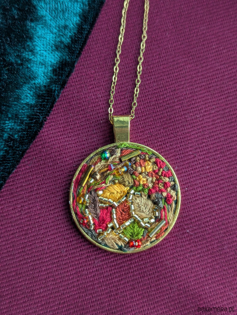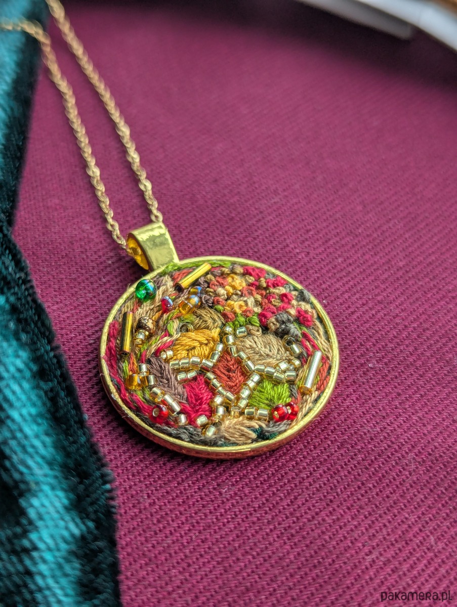Haft ma w sobie odrobinę abstrakcji – delikatne liście i kształty przenikają się, tworząc miękką, malarską fakturę. To biżuteria, która przywołuje wspomnienie światła między drzewami i szelestu liści pod stopami.