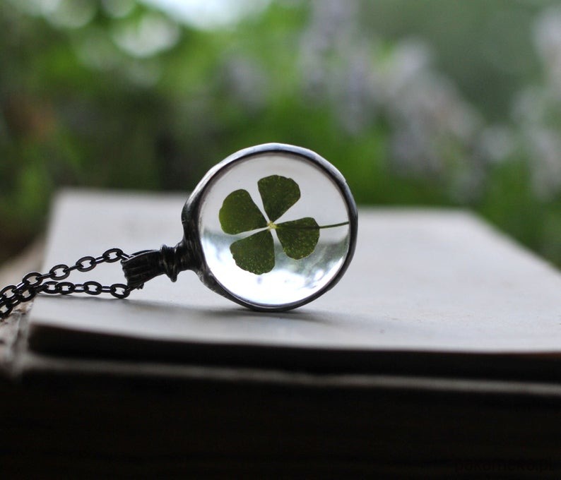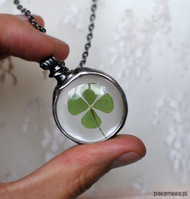 Za okrągłym szkłem umieszczona została prawdziwa, ususzona czterolistna koniczynka.