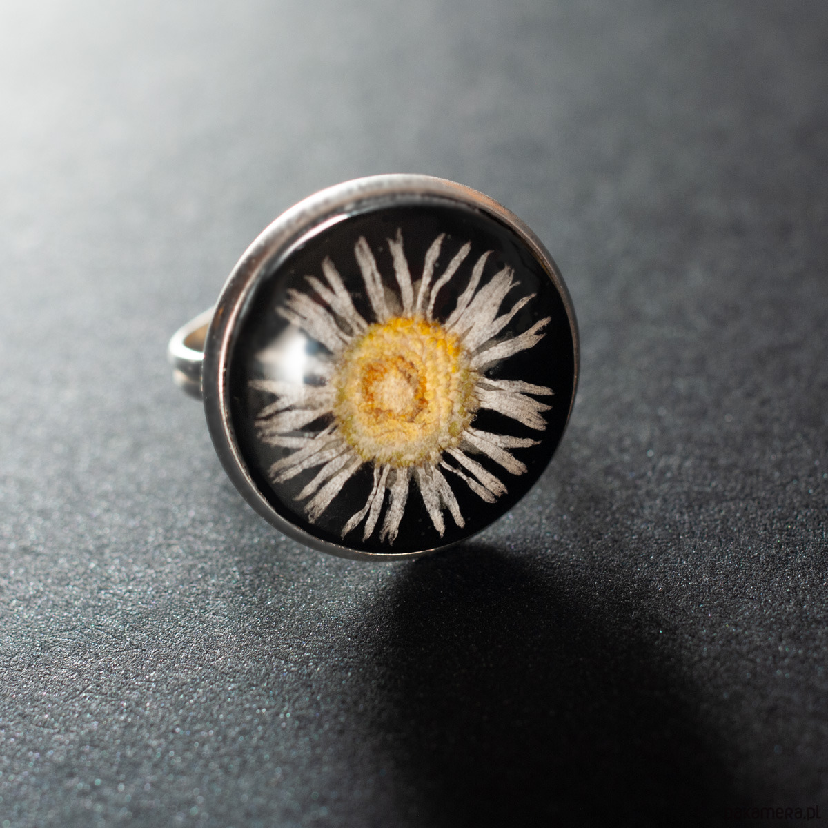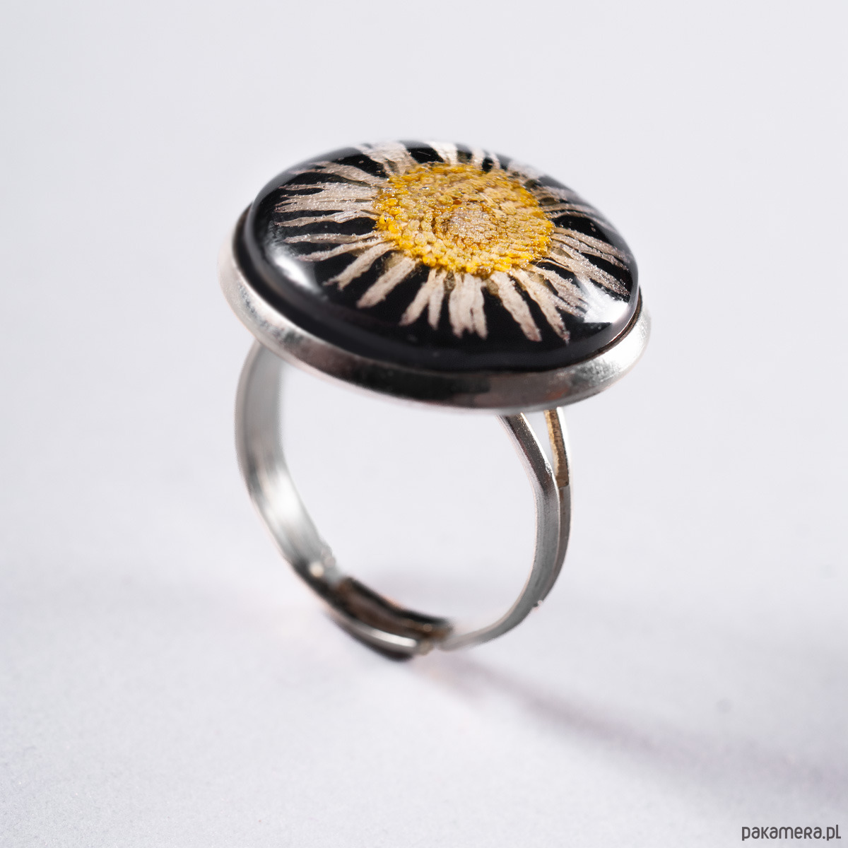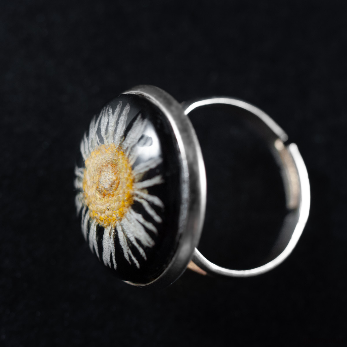 Pierścionek ze stokrotką w żywicy. w tle kwiatka żywica czarna. Obrączka i oprawa wykonana ze stopu metali jubilerskich w kolorze srebra. Rozmiar pierścionka regulowany (średnica o d 17 mm do 20 mm). Produkt jest lekki i elegancki. Nasza biżuteria oparta jest na autorskich projektach. Każdy kaboszon jest wykonywany ręcznie i jest niepowtarzalny. Wymiary: wielkość kaboszonu: 18 mm. Materiały: żywica, stop metali jubilerskich (nie zawiera niklu i ołowiu), kwiatek.