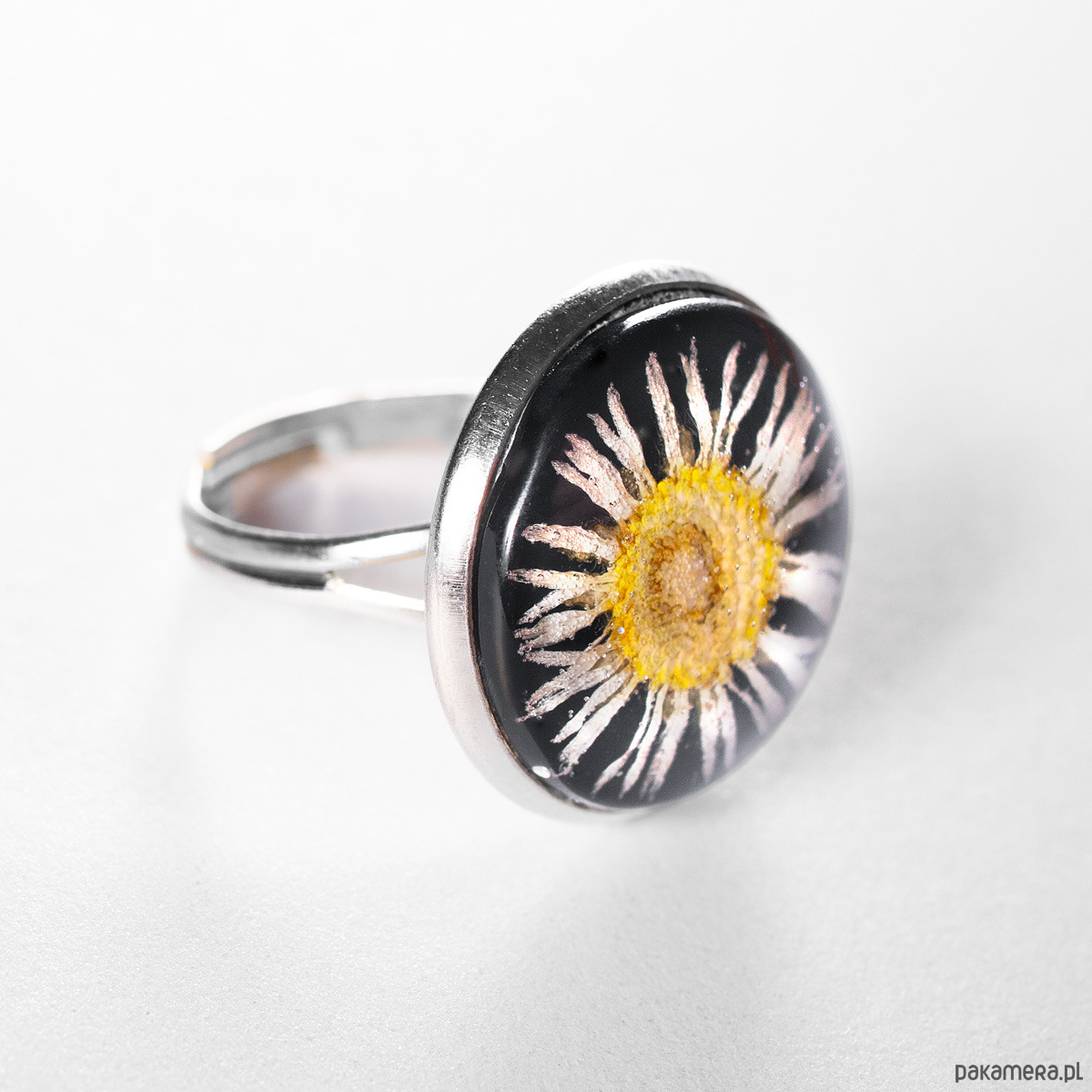 Okrągły pierścionek ze stokrotką w żywicy.