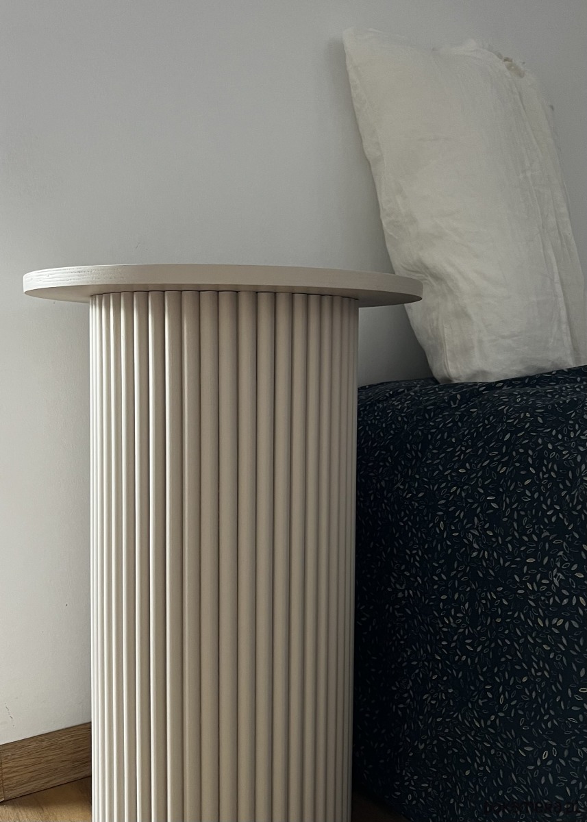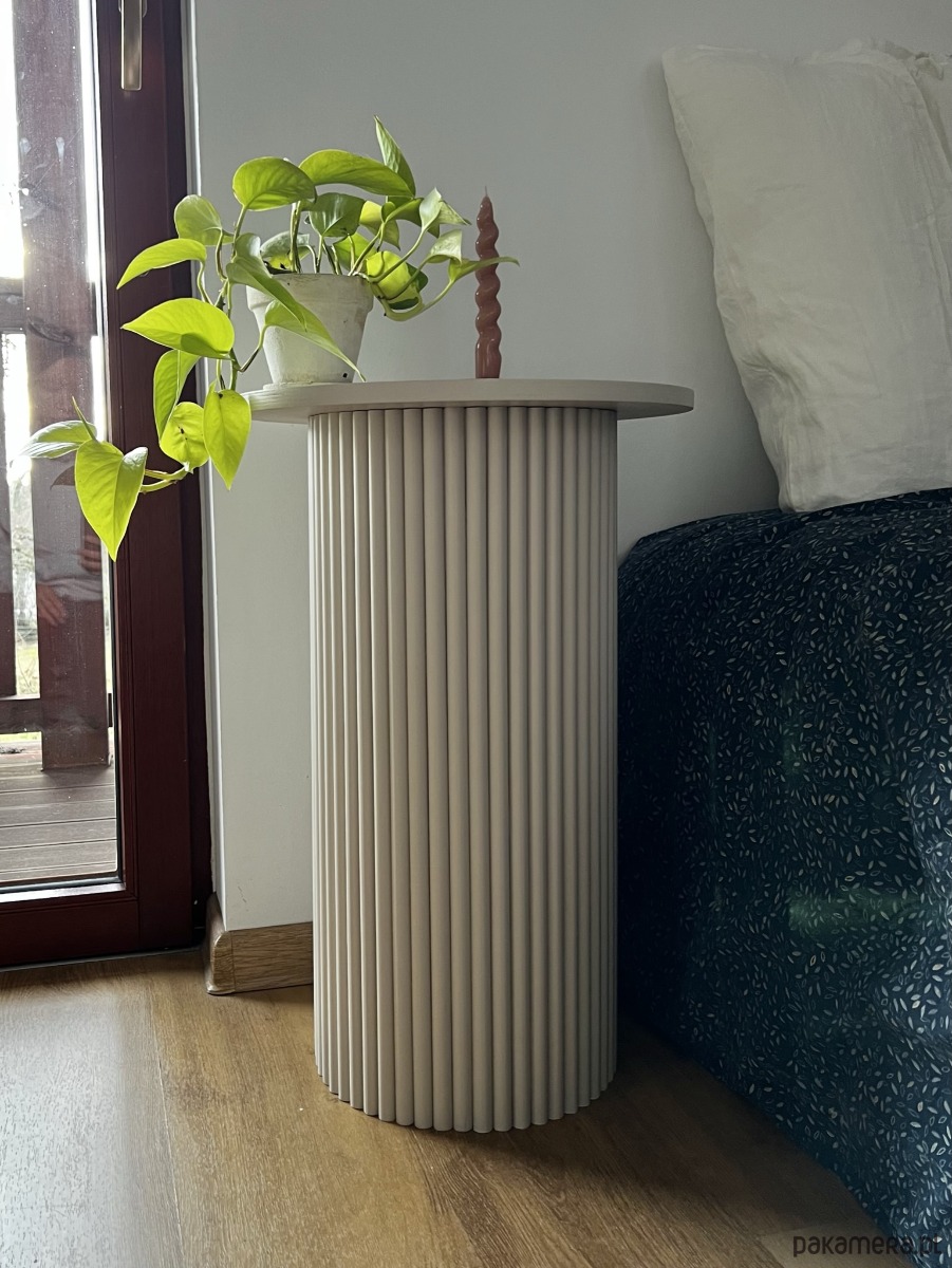 Okrągły, ryflowany, ciemnobeżowy stolik nocny, pomocniczy