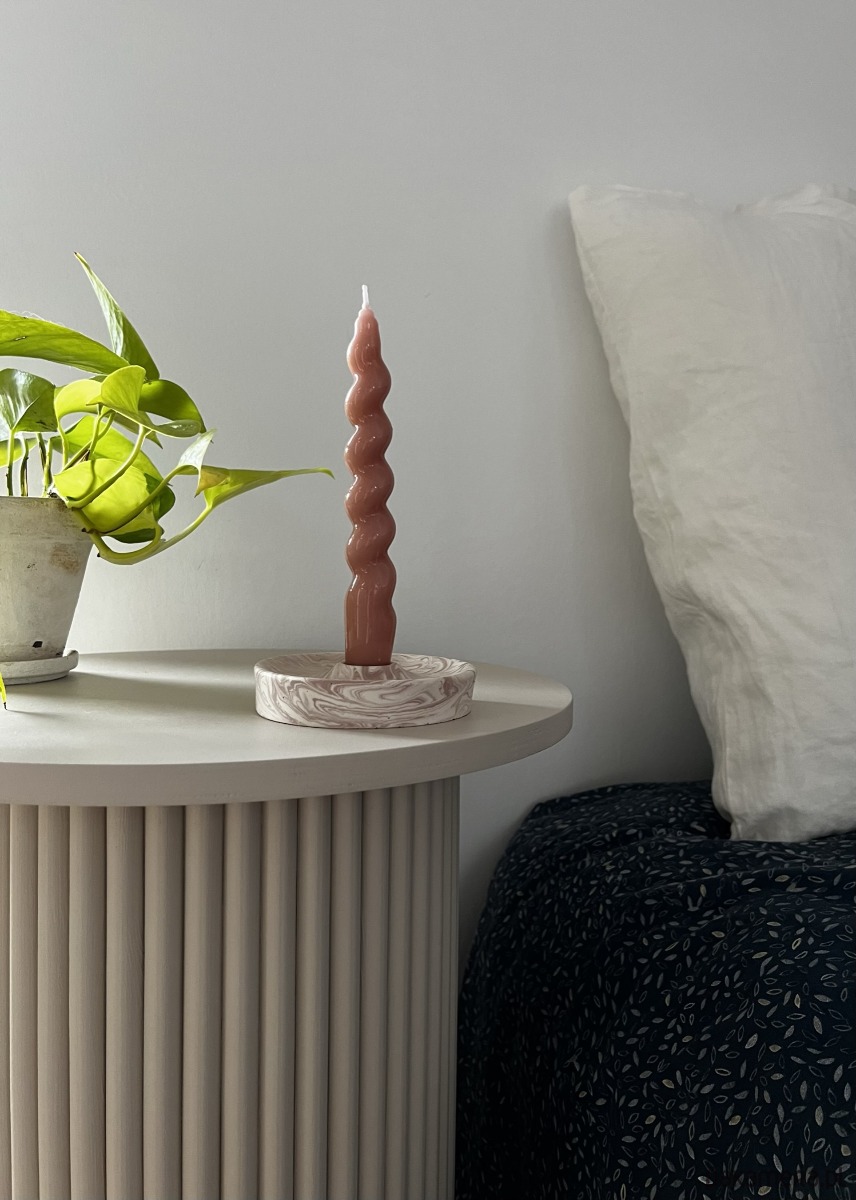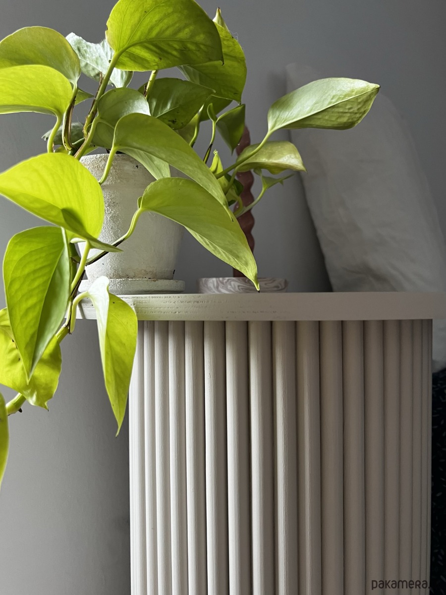 Minimalistyczna i ręcznie wykonana szafka nocna w cudownym głębokim beżowym kolorze przypominającym odcieniem uwielbianą kawę latte.