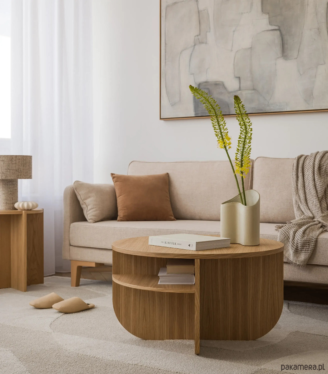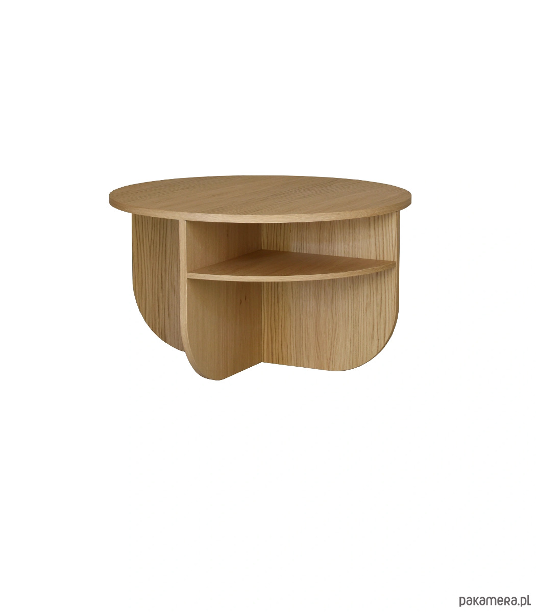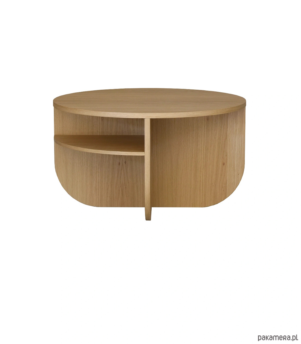 Okrągły, funkcjonalny stolik kawowy w kolorze naturalnego lub czarnego dębu. Mała praktyczna półka pod blatem.