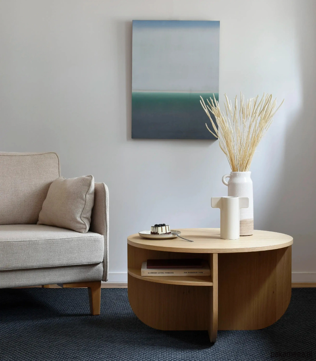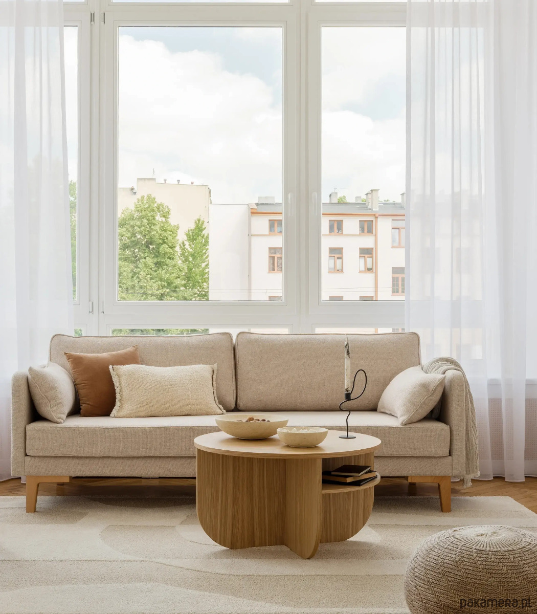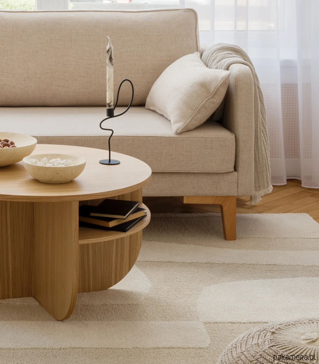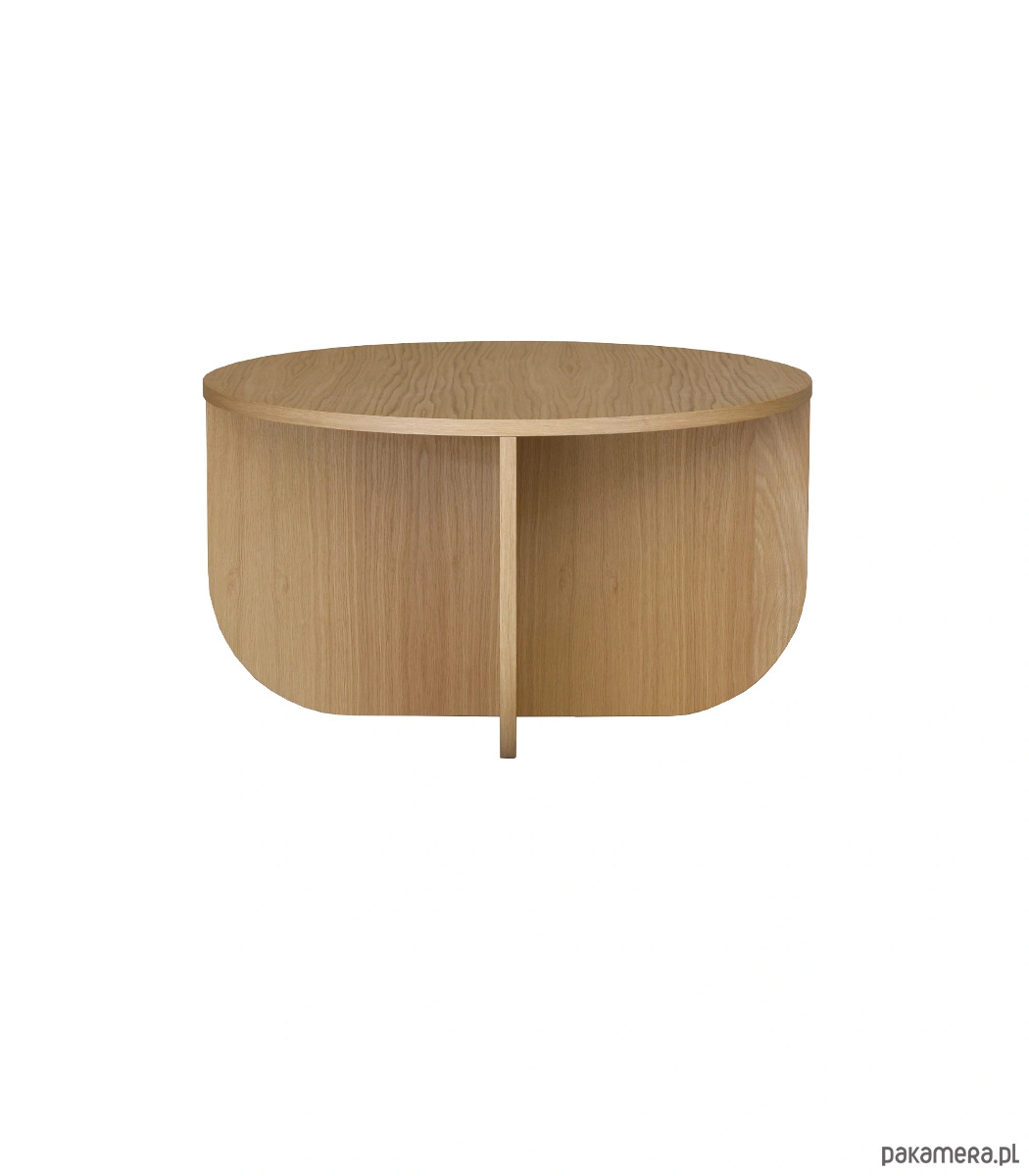 Okrągły, funkcjonalny stolik kawowy w kolorze naturalnego lub czarnego dębu. Mała praktyczna półka pod blatem.