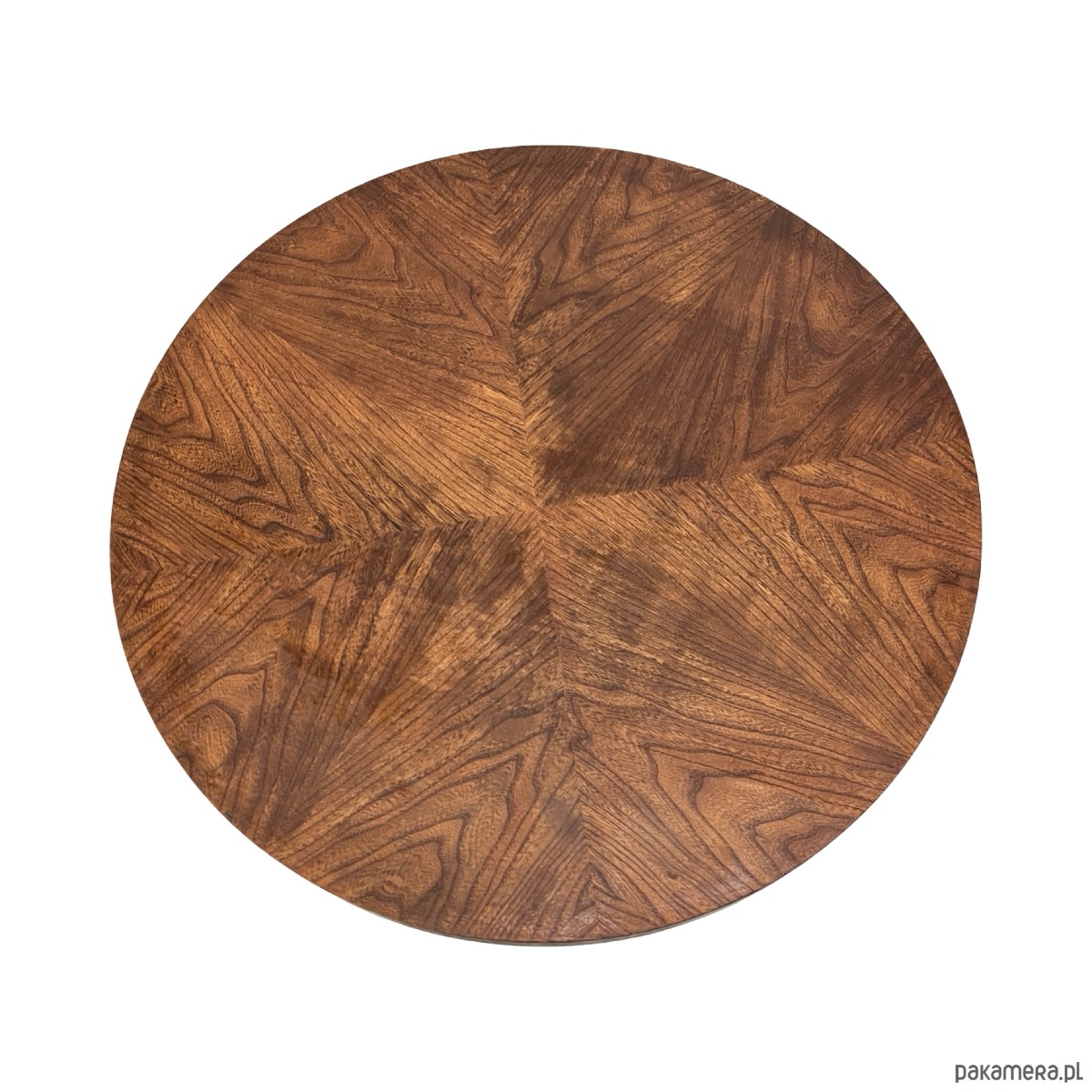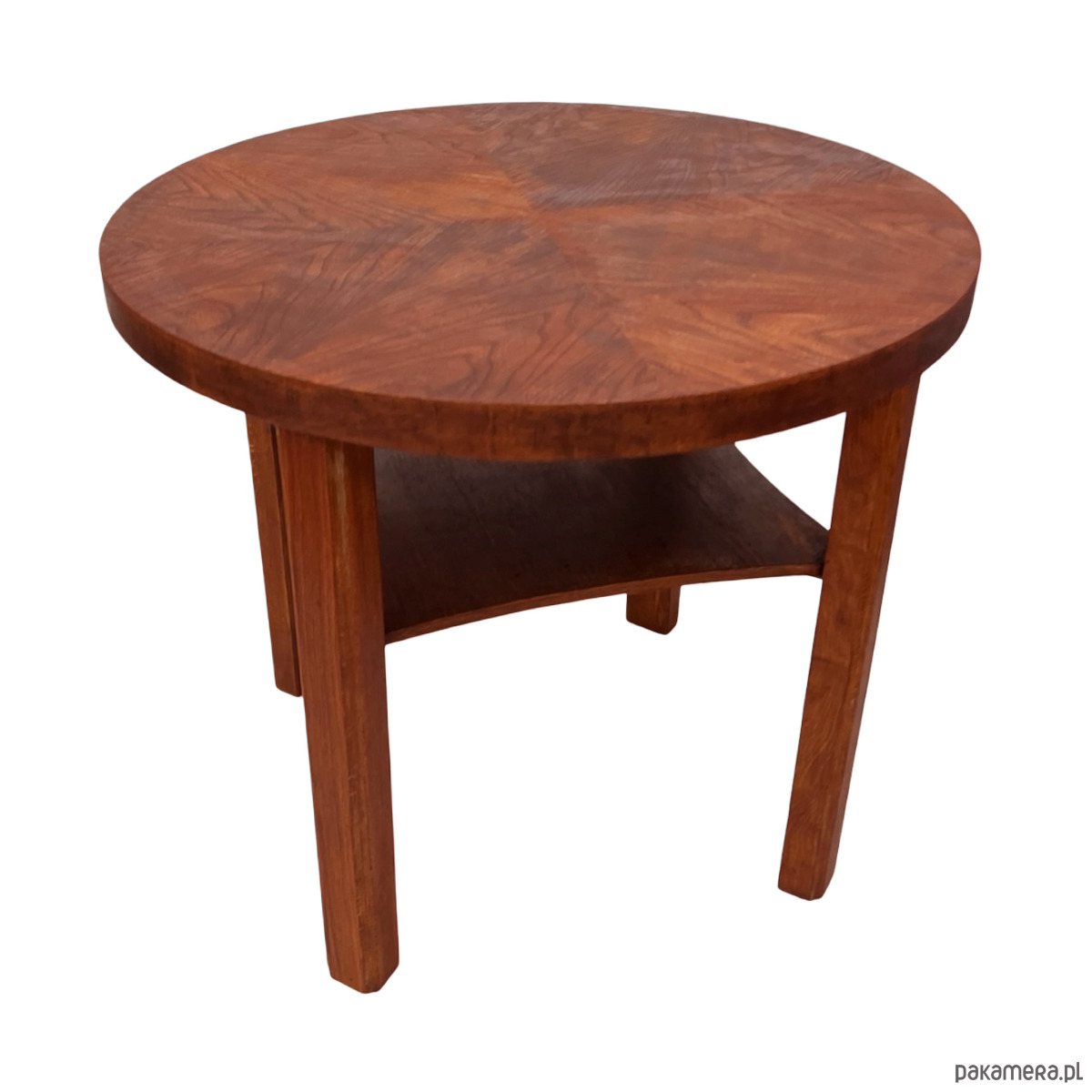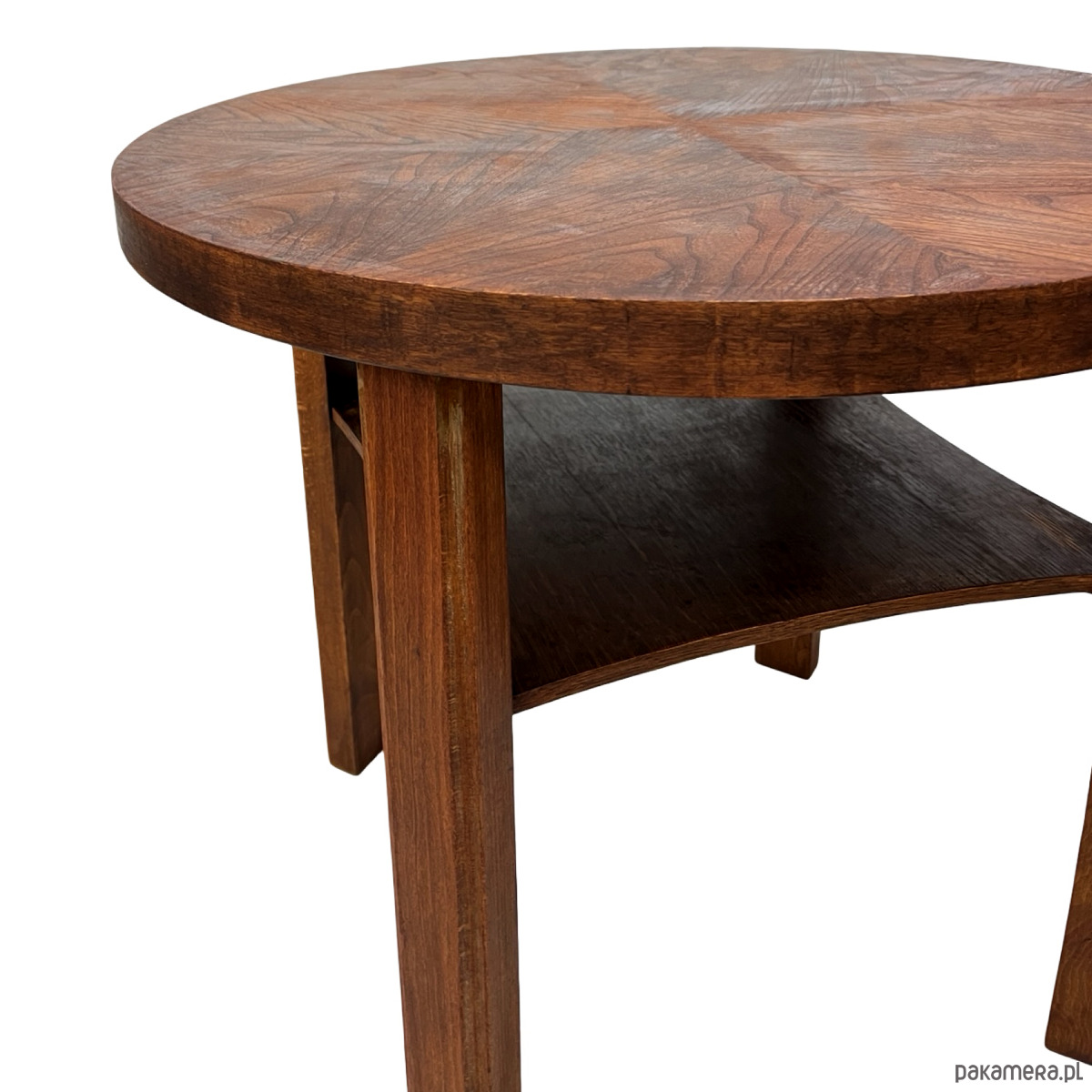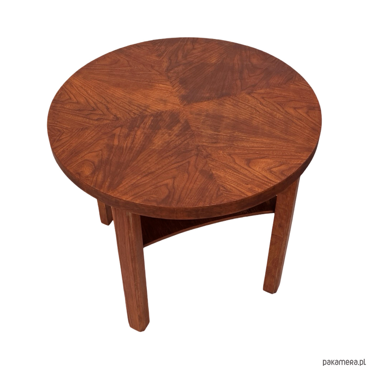 Elegancki, okrągły stolik kawowy w stylistyce Mid-Century Modern z wyraźnymi odniesieniami do Art Deco. Mebel wykonany z litego drewna oraz forniru układanego w dekoracyjny wzór promienisty („sunburst”), charakterystyczny dla projektów z lat 50.–60.